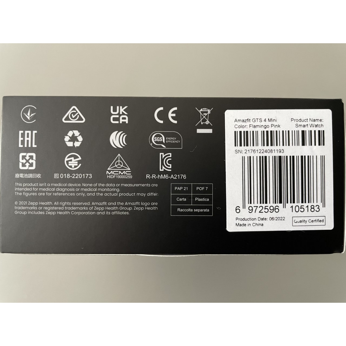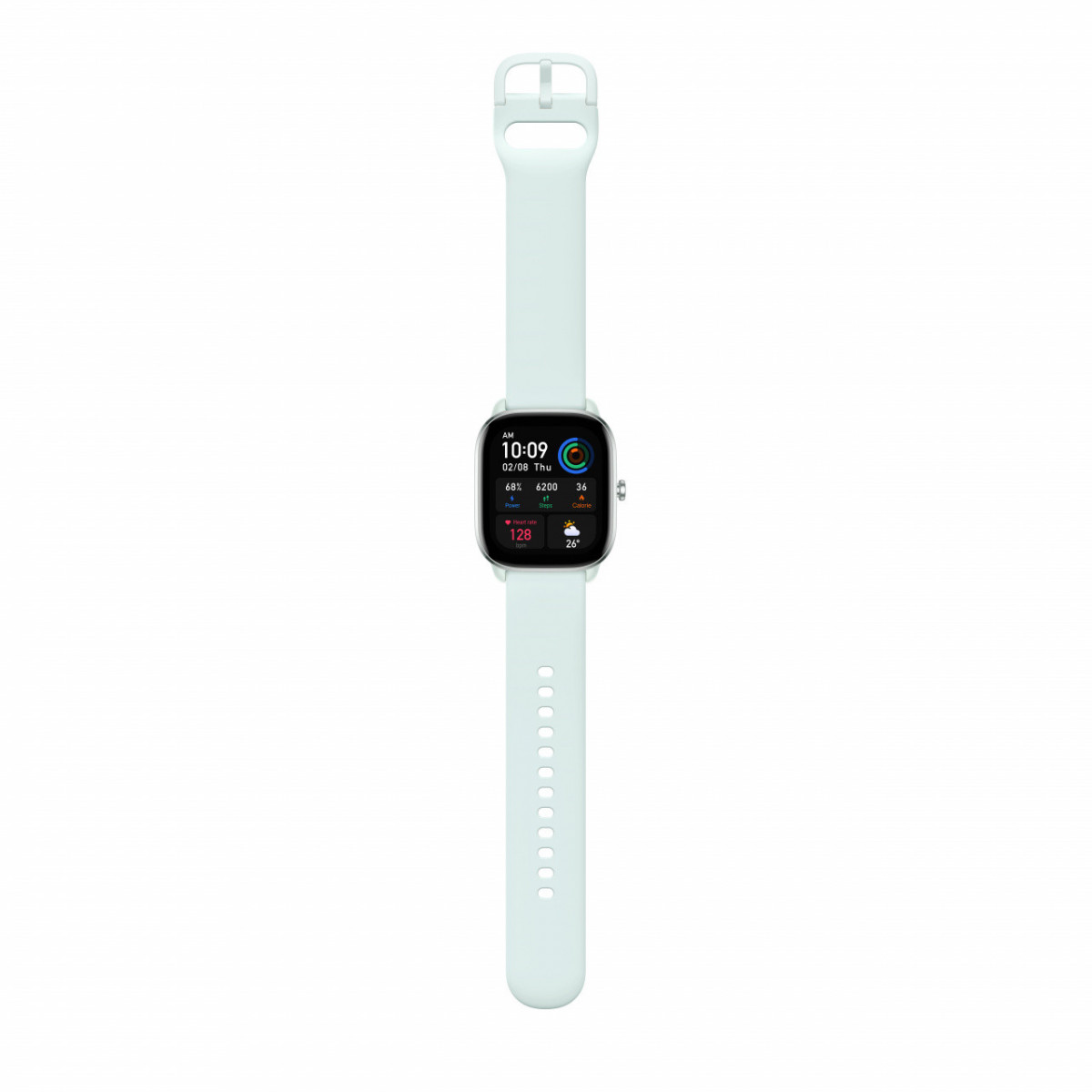 Amazfit GTS 4 mini. Dimensioni schermo: 4,19 cm (1.65"), Tecnologia display: AMOLED, Risoluzione del display: 336 x 384 Pixel, Touch screen. GPS (satellitare). Capacità della batteria: 270 mAh. Peso: 31,2 g. Materiale cinturino: Silicone, Colore cinturino: Blu