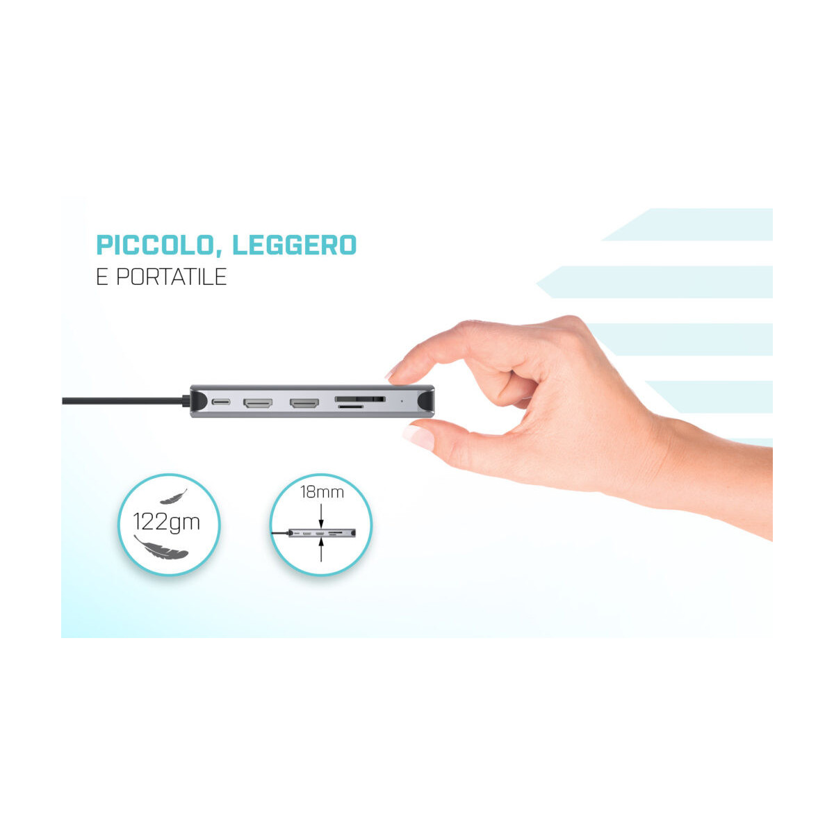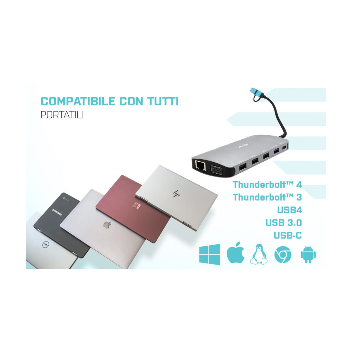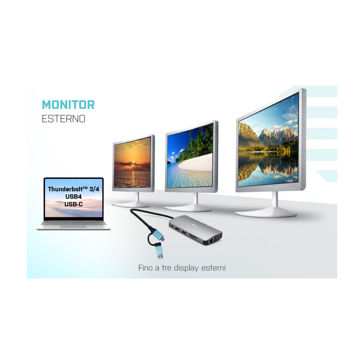 Una docking station potente ma piccola e portatile che supporta fino a tre monitor esterni. Il dock può essere utilizzato praticamente con qualsiasi computer portatile, in quanto supporta la connessione a tutte le porte più comuni: USB 3.0, USB-C, USB4 e Thunderbolt” 3/4, supportando tutti i più comuni sistemi operativi attuali. Tuttavia, il collegamento a tre monitor sarà possibile solo con un laptop dotato di una porta Thunderbolt 3/4 o di una porta USB-C che supporti il trasferimento video (modalità USB-C DP Alt).