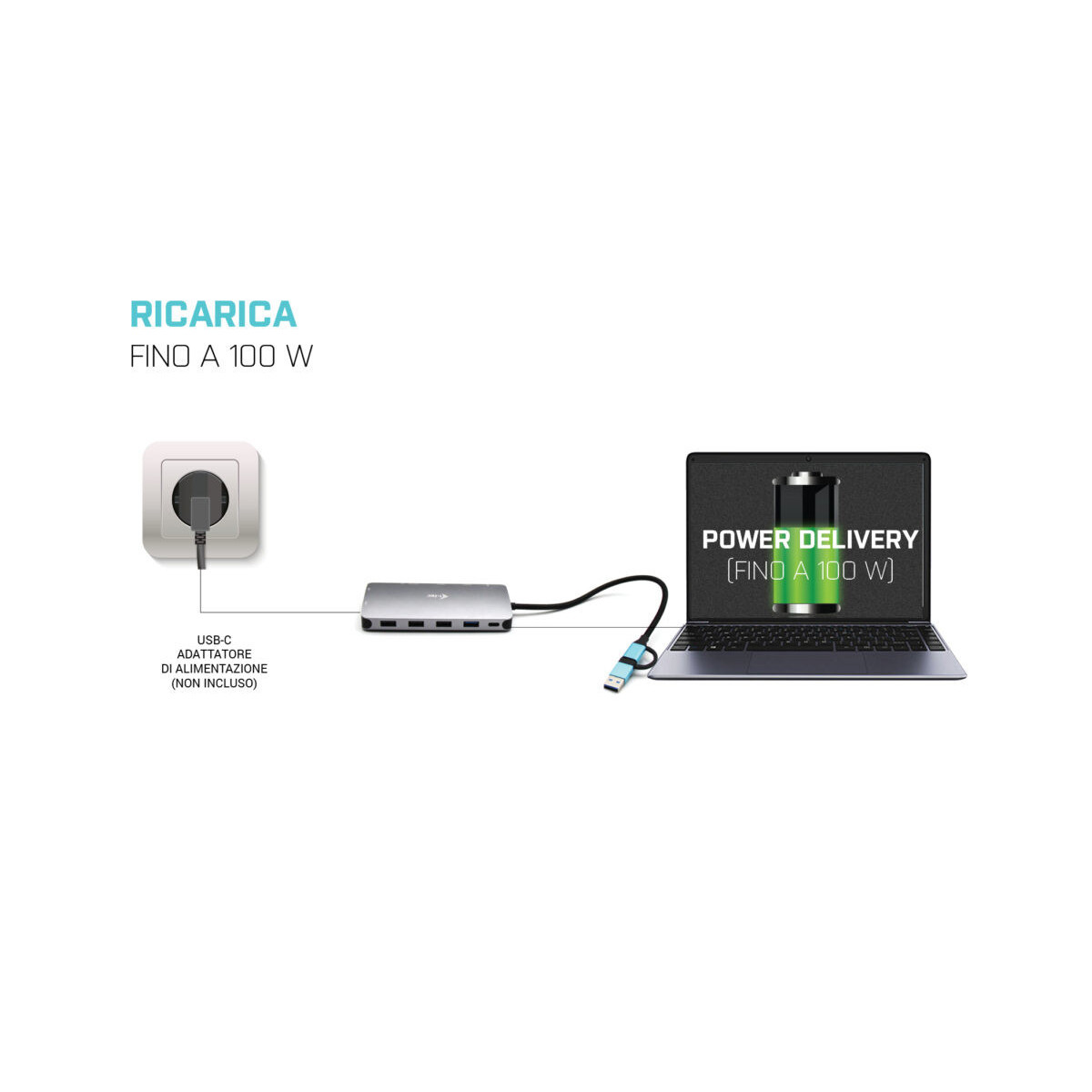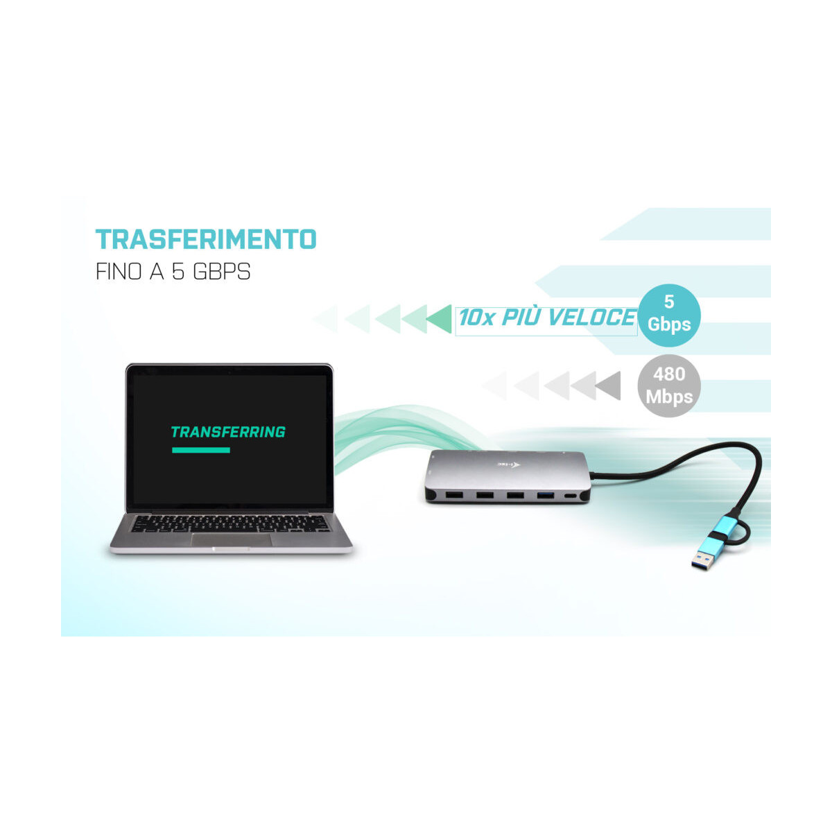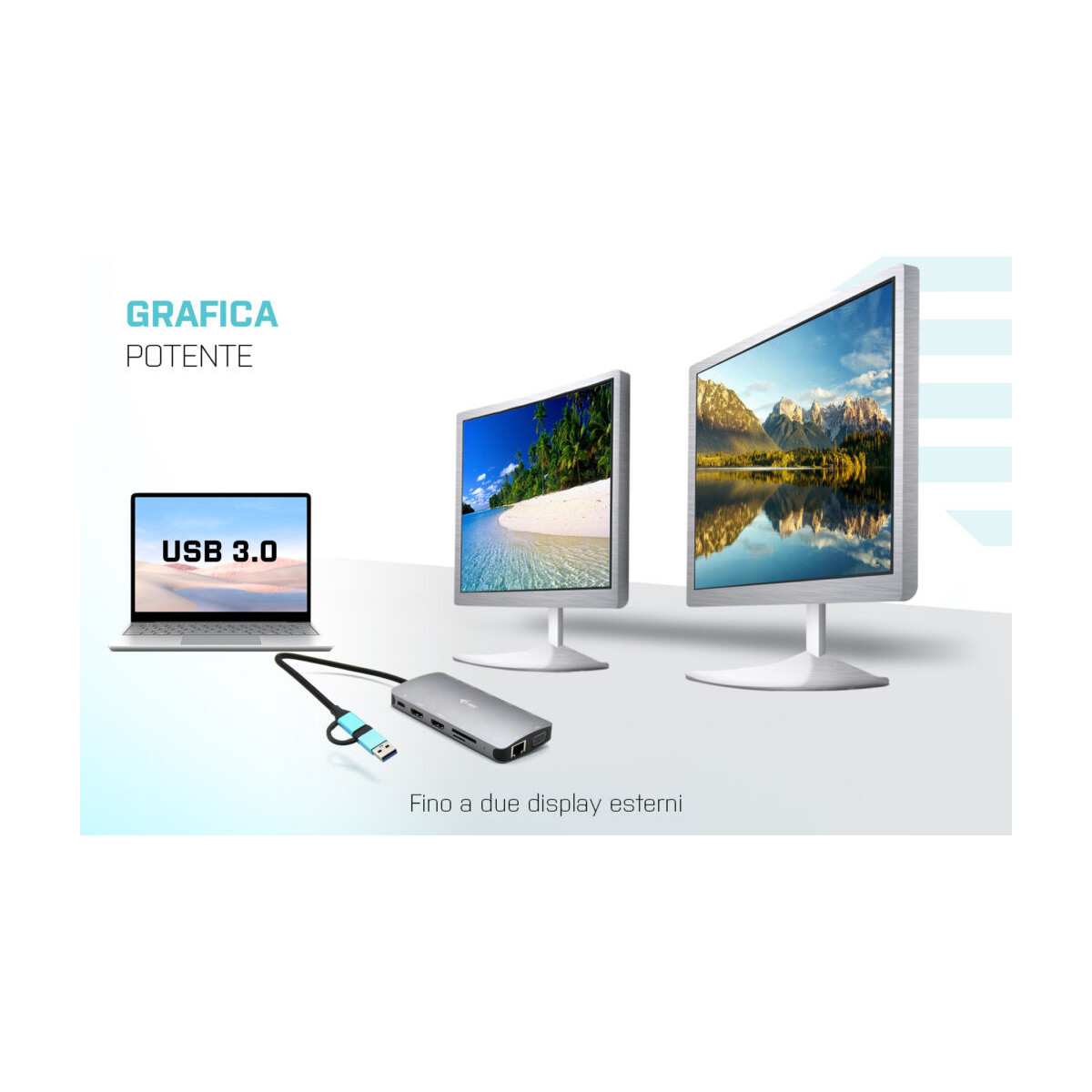 i-tec USB 3.0 USB-C/Thunderbolt 3x Display Metal Nano Dock with LAN + Power Delivery 100 W. Tecnologia di connessione: Cablato, Interfaccia host: USB 3.2 Gen 1 (3.1 Gen 1) Type-A + Type-C, Fornitura di alimentazione USB fino a: 100 W. Velocità trasferimento Ethernet LAN: 10,100,1000 Mbit/s. Colore del prodotto: Argento, Tipi schede di memoria: MicroSD (TransFlash), SD, Velocità di trasferimento dati: 5 Gbit/s. Tipologia alimentazione: USB. Altri sistemi operativi supportati: Android, Cromo