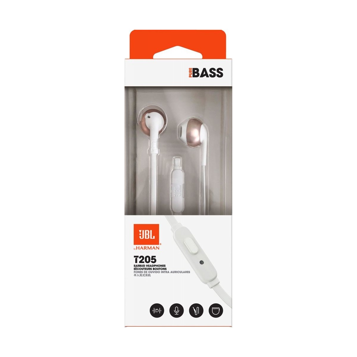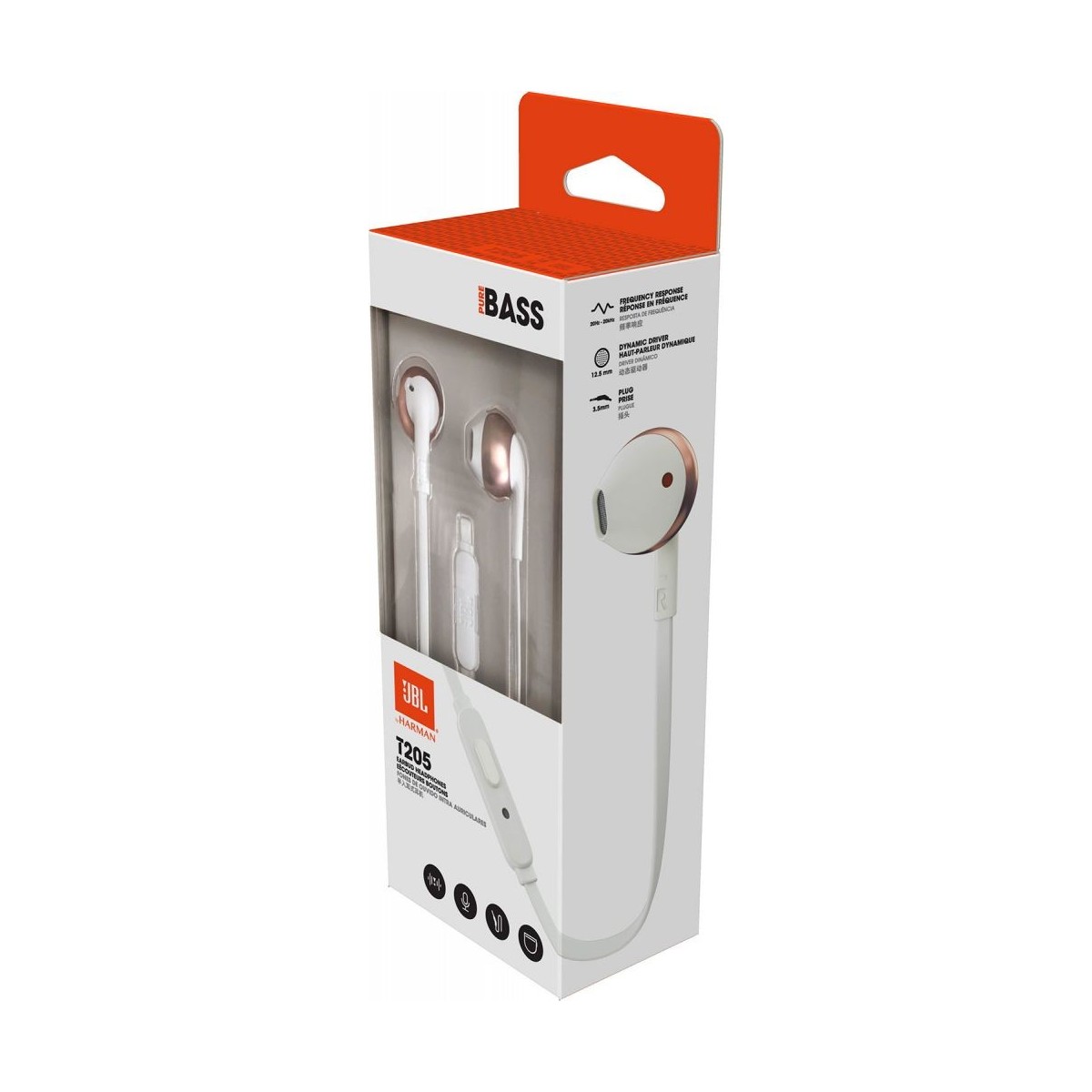 JBL T205. Tipo di prodotto: Cuffia, Stile d'uso: Auricolare, Colore del prodotto: Rose Gold. Tecnologia di connessione: Cablato. Disegno auricolare: Intraurale, Frequenza cuffia: 20 - 20000 Hz, Unità driver: 1,25 cm. Peso: 14,3 g