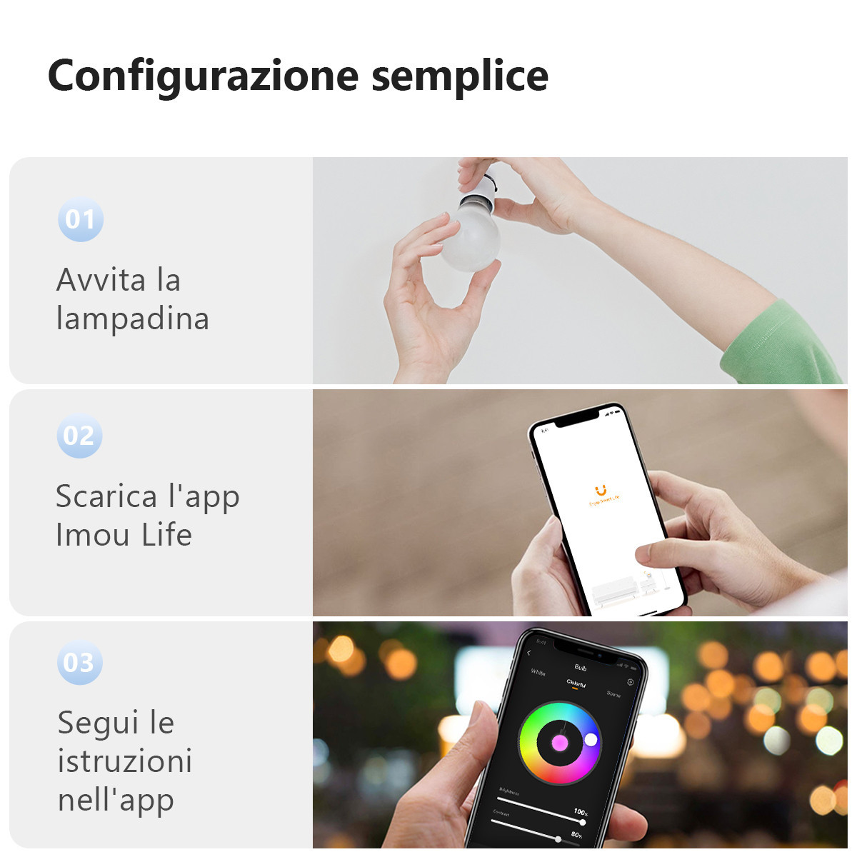 Aggiungi colore alla tua casa con la lampada intelligente Imou. La lampada B5 ha un attacco E27 ed è quindi adatta per la maggior parte delle lampade della casa. Puoi impostare il colore a tuo piacimento tramite l'app Imou Life. Puoi scegliere dalla luce bianca calda a quella fredda, da una tavolozza di 16 milioni di colori. Inoltre, è possibile selezionare scene preimpostate nell'app. la lampadina offre un'illuminazione adeguata per ogni ambiente. È anche possibile impostare orari di accensione e spegnimento. La lampadina intelligente B5 è compatibile con Google Assistant e Amazon Alexa così puoi gestirla tramite il controllo vocale e renderla parte della tua casa intelligente.