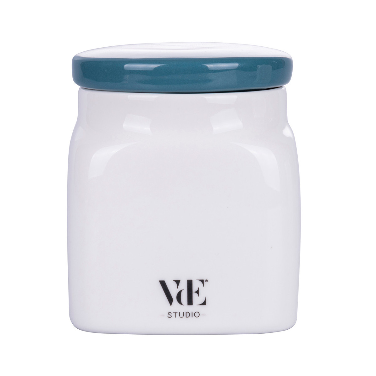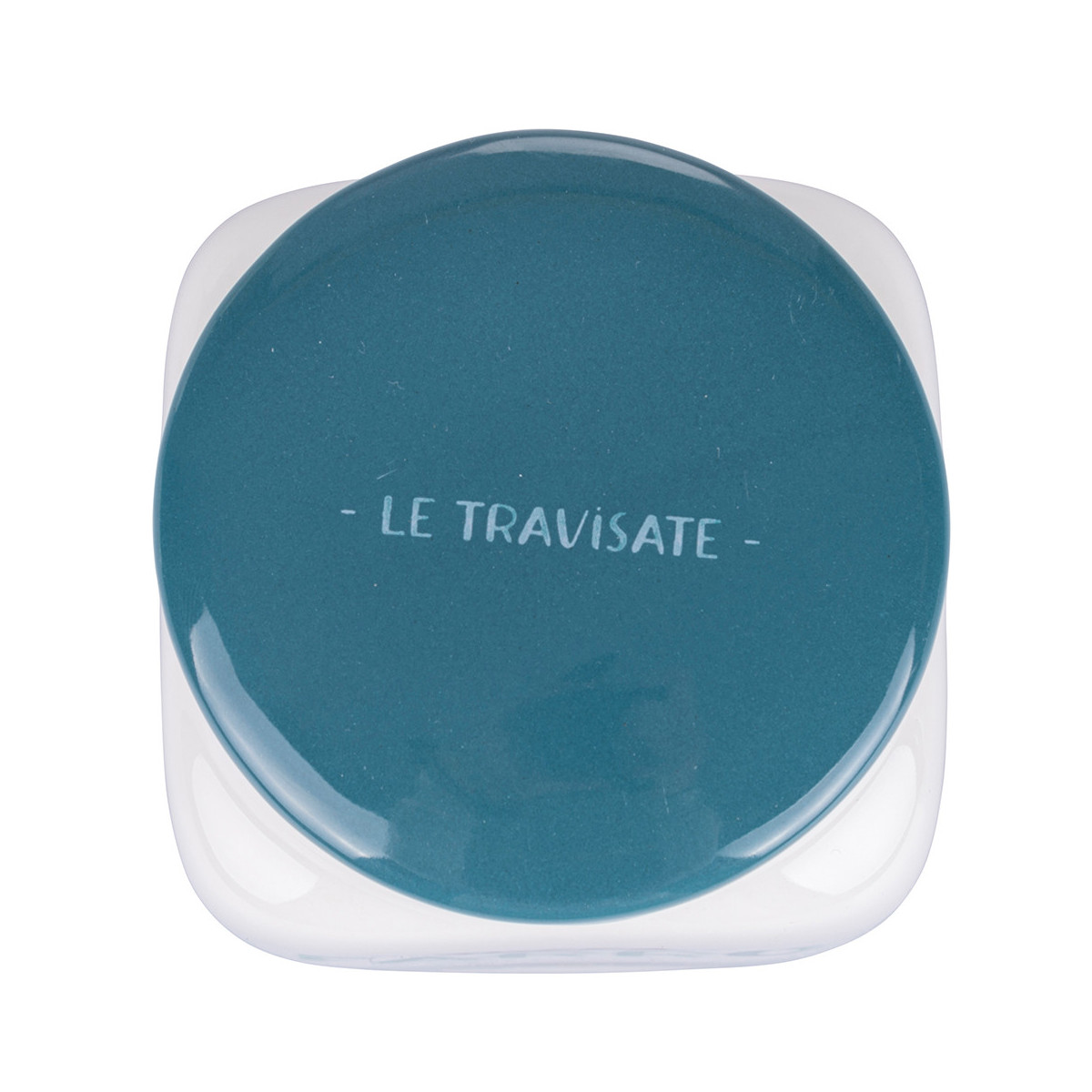 Colore: bianco con scritte acquamarina e beige, coperchio ottanio, finitura lucida