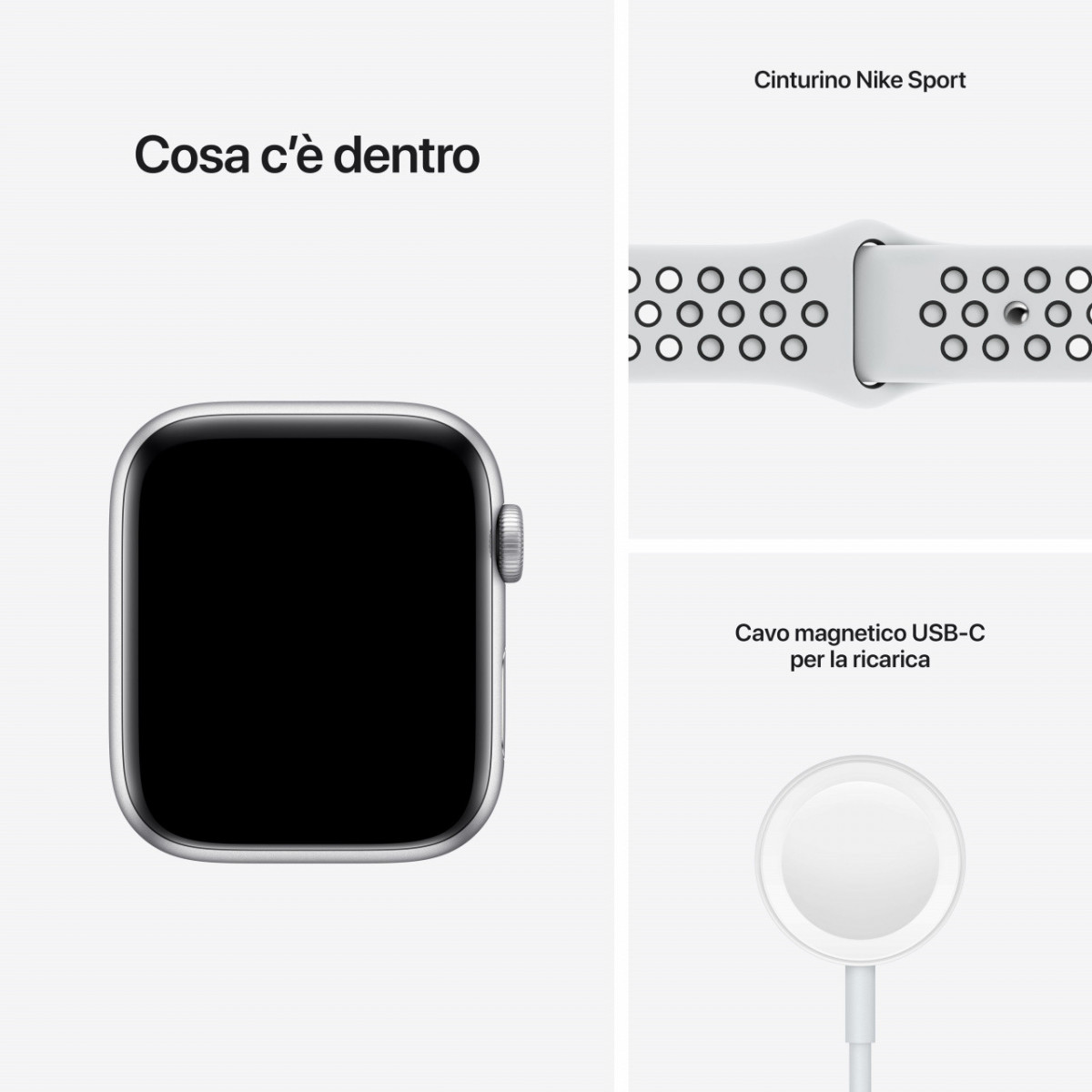 Apple Watch Nike SE GPS, 44mm Cassa in Alluminio color Argento con Cinturino Sport Puro Platino/Nero. Tecnologia display: OLED, Risoluzione del display: 368 x 448 Pixel, Touch screen. Memoria flash: 32 GB. Wi-Fi. GPS (satellitare). Peso: 36,2 g. Impermeabile fino a: 50 m, Materiale cinturino: Fluoroelastomero, Colore cinturino: Nero, Platino, Dimensione del cinturino: S/M & M/L