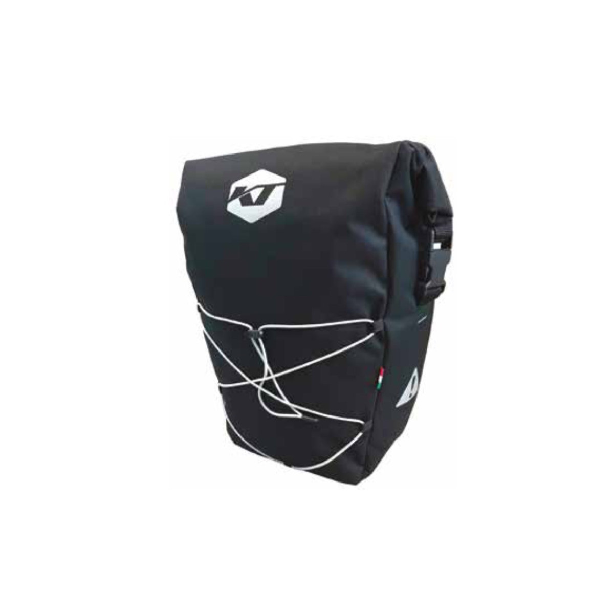 Borsa Singola Laterale, studiata per essere posizionata su portapacchi standard e fissata mediante due ganci e una cinghia con velcro. Comoda chiusura ad avvolgimento sulla parte superiore con doppia clip ai lati, cordoncino elastico sulla parte frontale. Prodotto in Italia.
