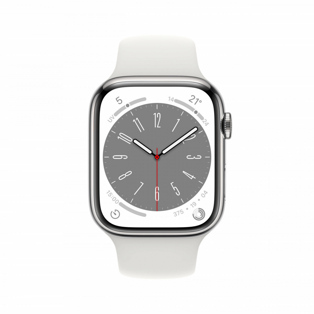 Apple Watch Series 8 GPS + Cellular 45mm Cassa in Acciaio Inossidabile color Argento con Cinturino Sport Band Bianco - Regular. Tecnologia display: OLED, Risoluzione del display: 396 x 484 Pixel, Touch screen. Memoria flash: 32 GB. Wi-Fi. GPS (satellitare). Peso: 51,5 g. Impermeabile fino a: 50 m, Colore cinturino: Bianco. Sistema operativo incluso: watchOS 9