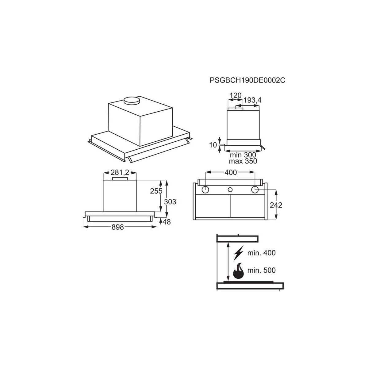 Electrolux EFP129X. Potenza massima di estrazione: 360 m³/h, Tipo di estrazione: Aspirante/Filtrante, Classe di efficienza dinamica del fluido: D. Tipo: Integrato, Colore del prodotto: Acciaio inossidabile, Numero di lampadine: 2 lampadina(e). Tipo di filtro antigrasso: Alluminio, Numero di filtri: 3 pezzo(i). Classe efficienza energetica: C, Potenza motore: 125 W, Consumo energetico annuo: 51 kWh. Larghezza: 898 mm, Profondità: 299 mm, Altezza (max): 30,5 cm