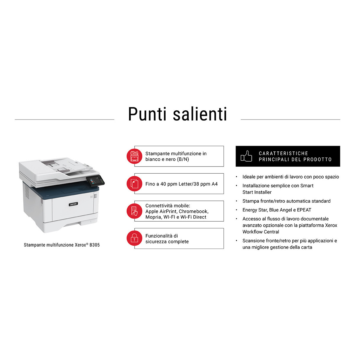 Xerox B305 A4 38 ppm Copia/Stampa/Scansione fronte/retro wireless PS3 PCL5e/6 2 vassoi 350 fogli