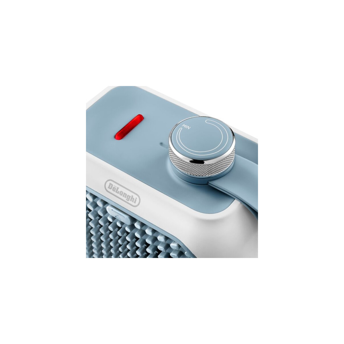 De’Longhi HFX10B03.LB. Tipo: Riscaldatore ambiente elettrico con ventilatore, Tipologia elemento riscaldante: Ceramica. Adatto per: Interno, Opzioni di posizionamento: Scrivania, Colore del prodotto: Blu, Grigio. Potenza termica: 360 W, Livello di rumore della ventola (max): 35 dB, Tipo di controllo del termostato: Meccanico. Potenza: 360 W, Tensione di ingresso AC: 220-240 V, Frequenza di ingresso AC: 50-60 Hz. Larghezza: 150 mm, Profondità: 100 mm, Altezza: 175 mm