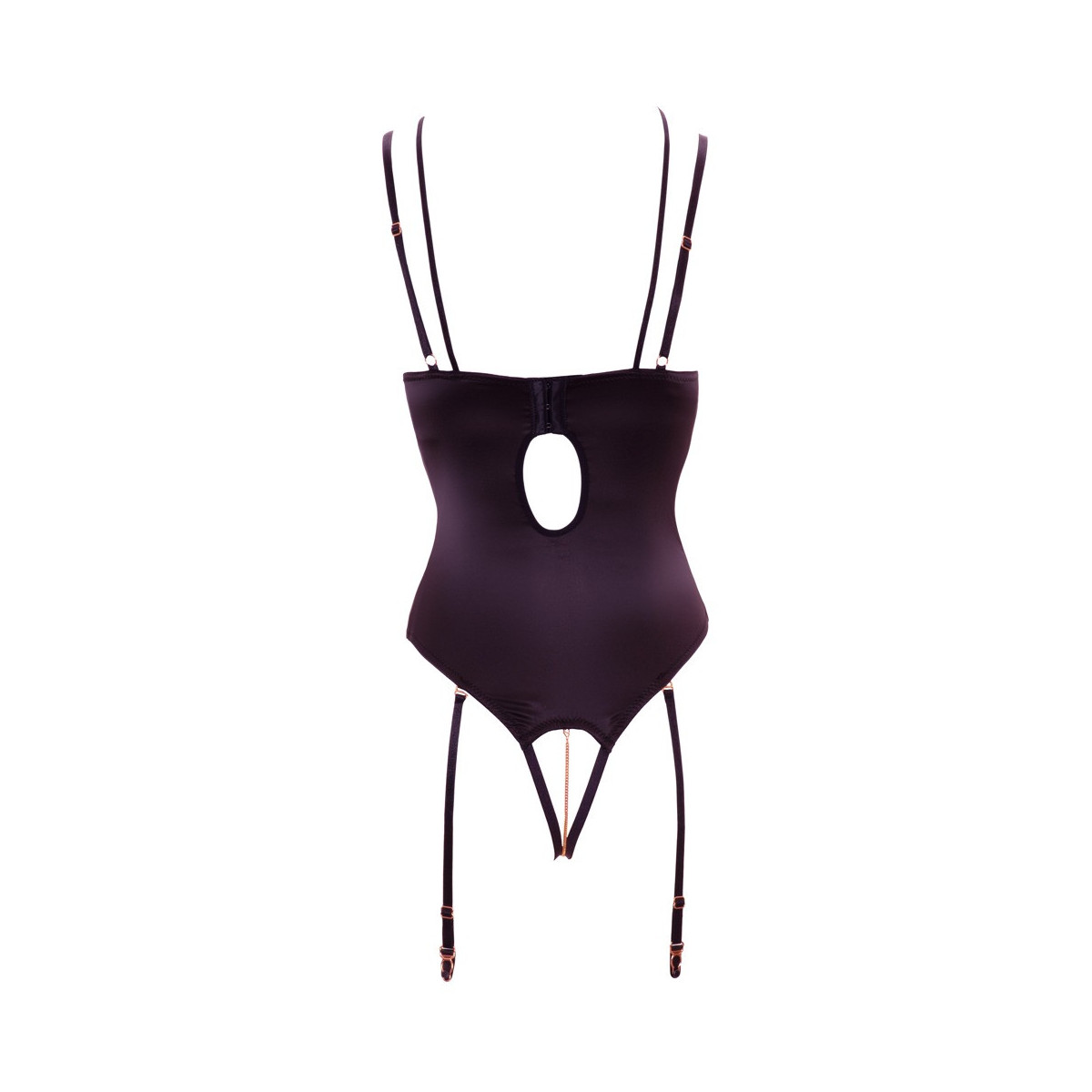 Esclusivo reggicalze con coppe imbottite con ferretto e 4 bretelle estraibili. Raffinati sono i piccoli dettagli che fanno la differenza; nel cavallo c'è una catena che stimola sensualmente chi lo indossa ad ogni movimento. Il décolleté è ornato da 6 cinturini regolabili, coronati da due anelli scintillanti. L'elevatore a ferretto modella i seni e li mette abilmente in scena. Una vestibilità ideale è garantita dalla chiusura a gancio nella parte posteriore.