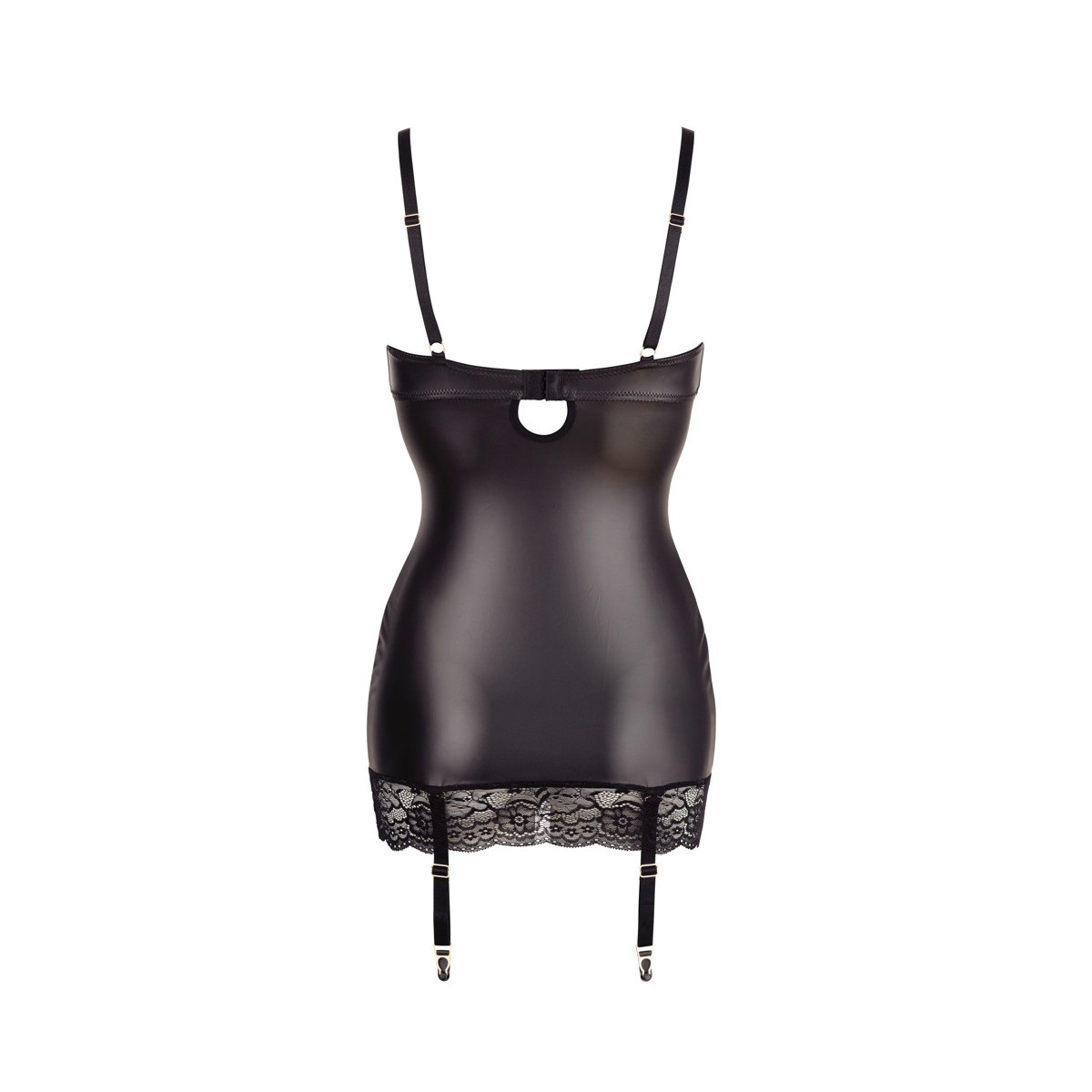 Abito intimo aderente al corpo con orlo leggermente foderato e dettagli delle spalline. Nella parte anteriore con allacciatura e anello decorativo. Preziosi inserti in pizzo sul davanti e sull'orlo rendono il look sexy perfetto. Cinghie regolabili. Cinghie e bretelle regolabili e rimovibili. Dettagli in metallo color oro.