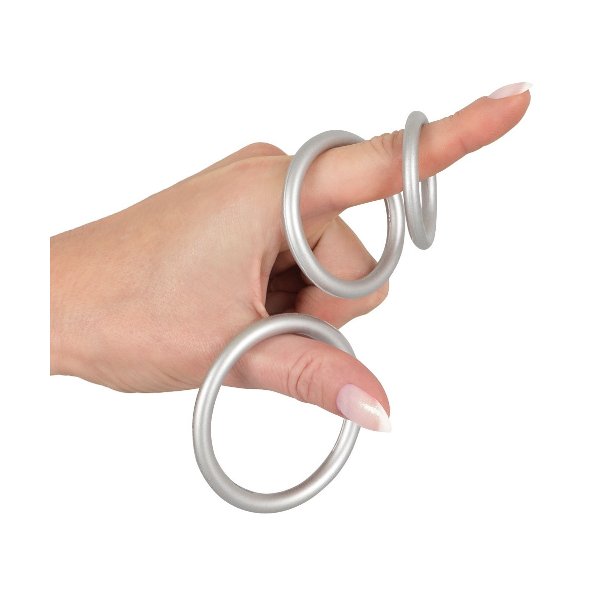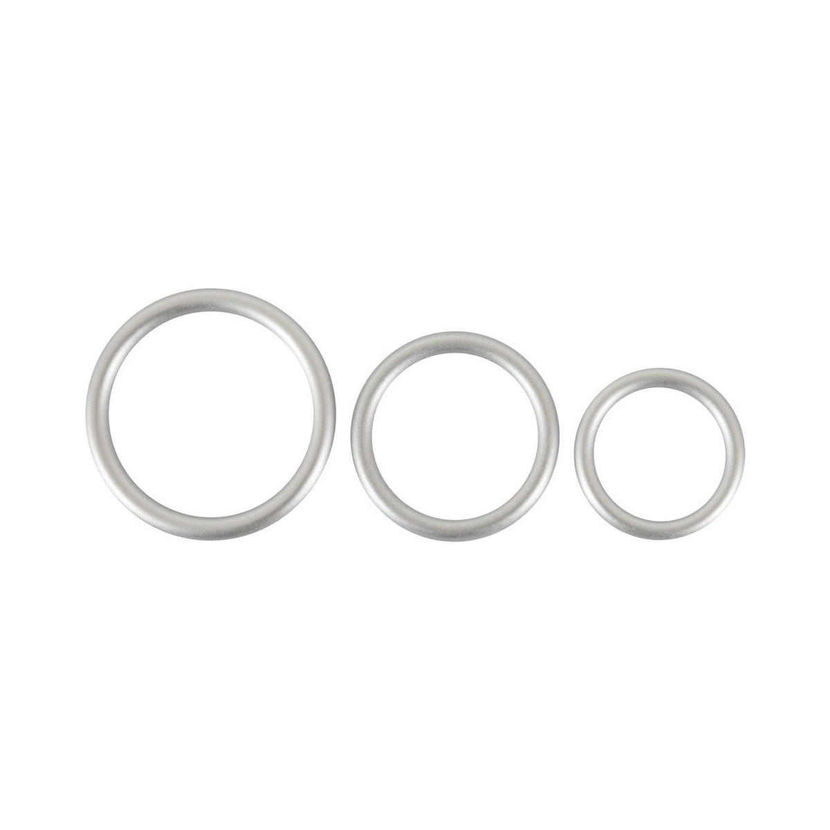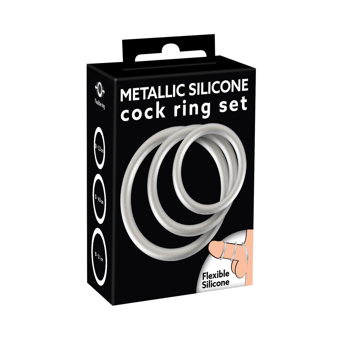 Tre anelli per pene/testicoli di dimensioni diverse in un set. In un aspetto metallico pericoloso con il comfort e la sicurezza del silicone. Molto flessibile si mettono intorno al pene e ai testicoli e provvedono ad avere erezioni dure come la pietra e particolarmente lunghe.