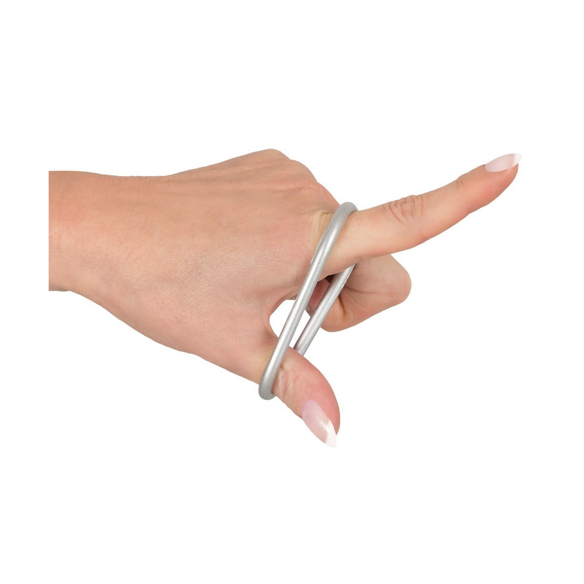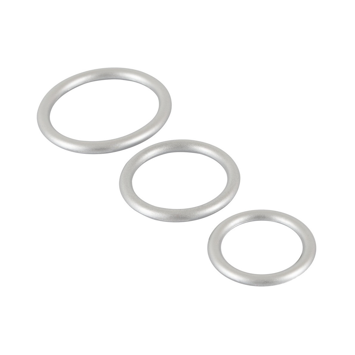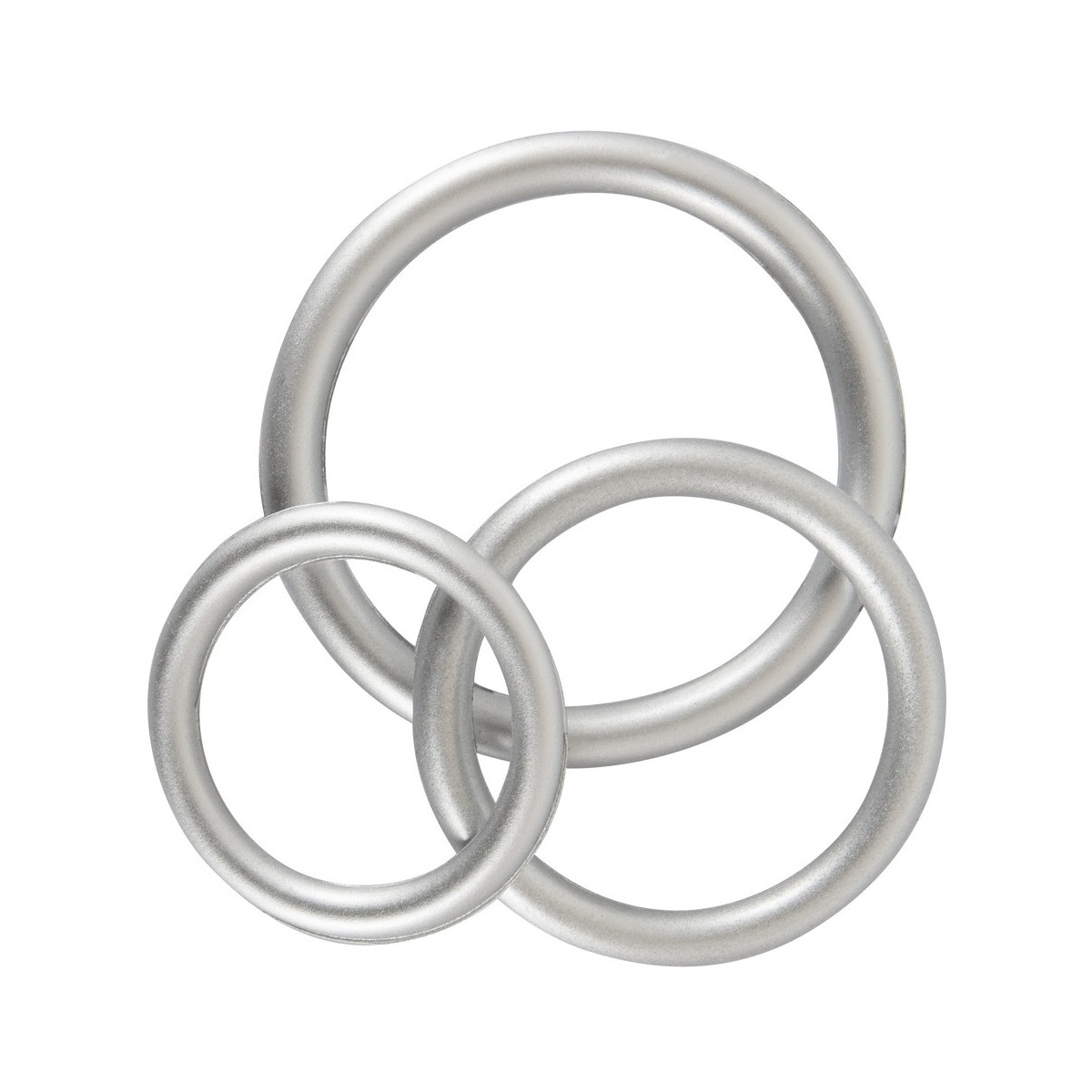 Tre anelli per pene/testicoli di dimensioni diverse in un set. In un aspetto metallico pericoloso con il comfort e la sicurezza del silicone. Molto flessibile si mettono intorno al pene e ai testicoli e provvedono ad avere erezioni dure come la pietra e particolarmente lunghe.