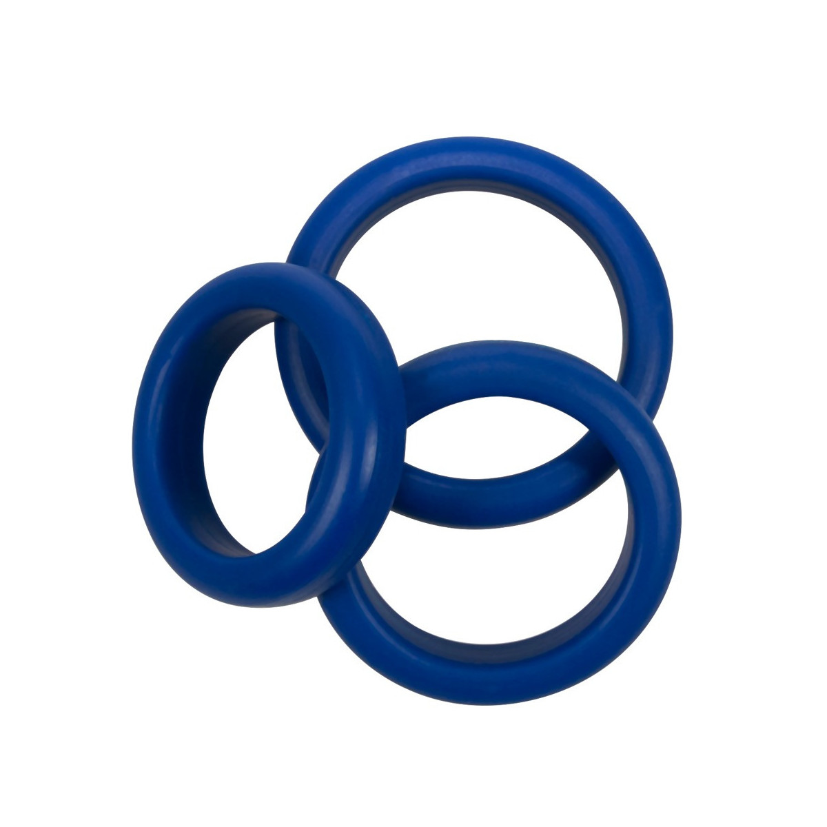 Set di 3 anelli blu per il pene. Anche per l'allacciatura dei testicoli. Può essere utilizzato singolarmente o in combinazione. Molto elastico. à 4,5 cm, 4 cm e 3,5 cm. Materiale: silicone.