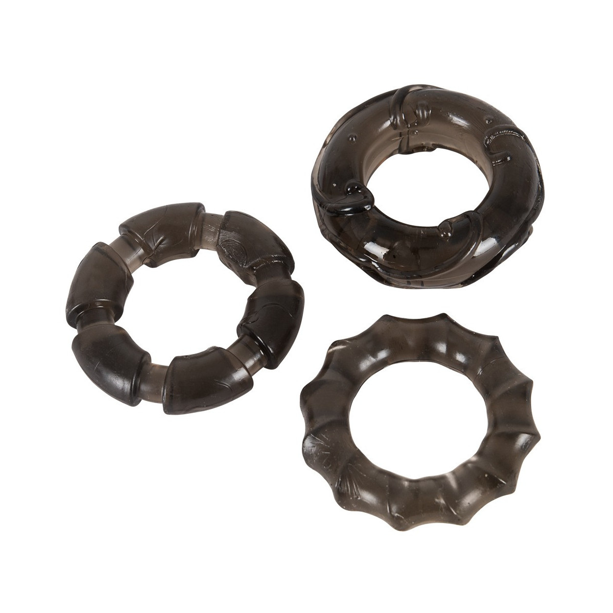 Trio di anelli elastici per il pene molto elastici con diverse strutture di stimolo e diametri. Diametro interno 2,4-2,6 cm. Materiale: TPE.