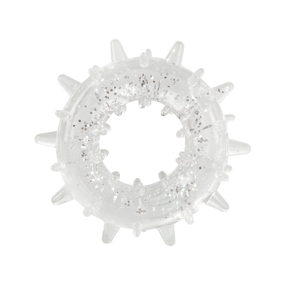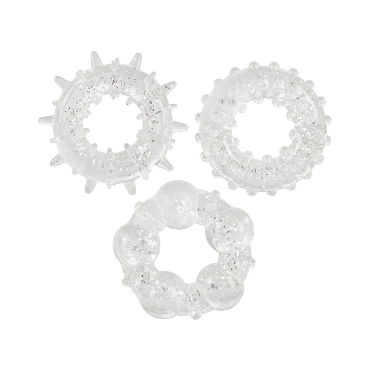 Tre anelli dai rilievi morbidi e dentati che sembrano decorazioni di cristallo! Ã ca. 1,5 cm (espandibile). Materiale: TPE.