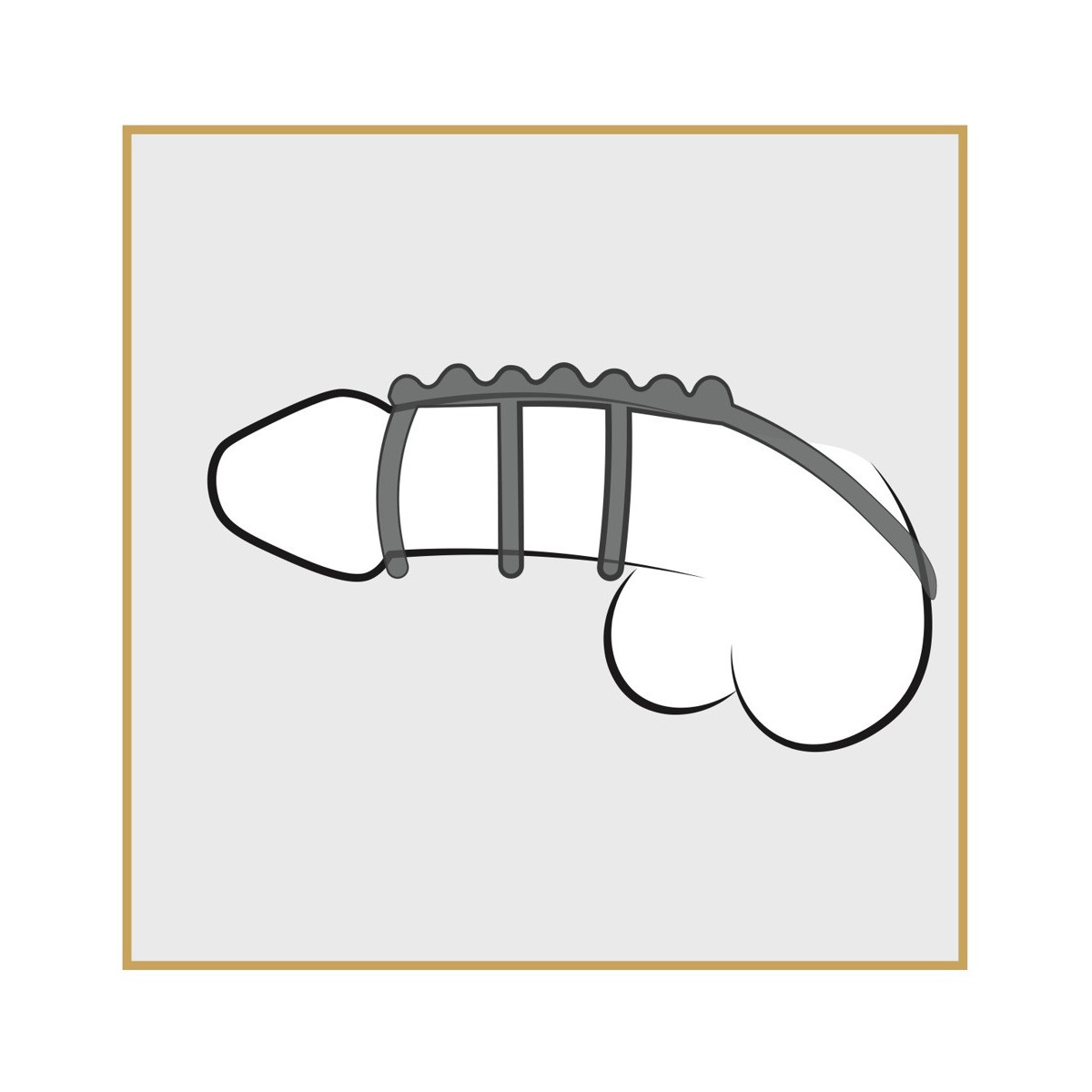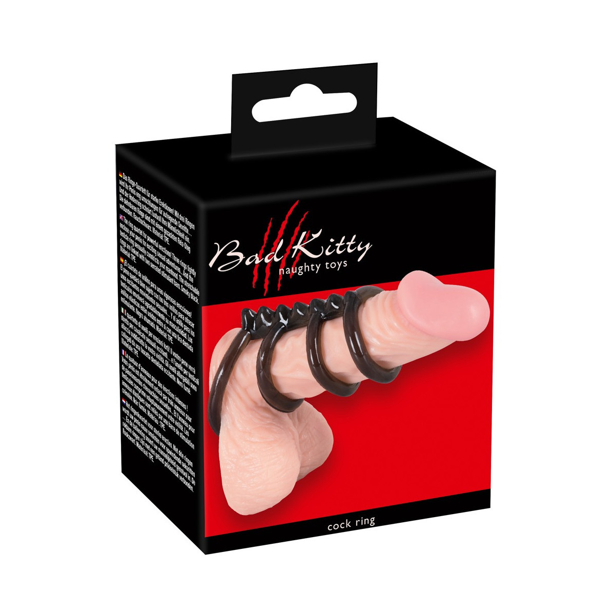 Quartetto di anelli del pene, collegati con una barra di stimolazione dentellata.