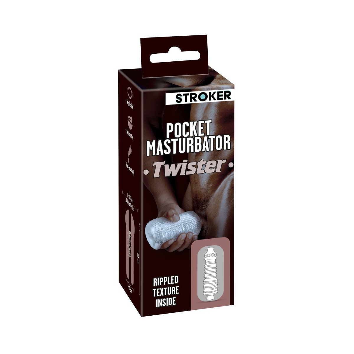 Masturbatore tascabile Twister di Stroker, extra maneggevole e trasparente, con eccitante struttura di scanalature e nub all'interno. Il masturbatore elasticizzato ha anche una superficie nodosa all'esterno in modo da non scivolare via anche durante gli alti e bassi selvaggi.
