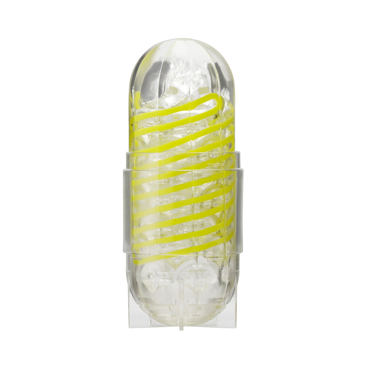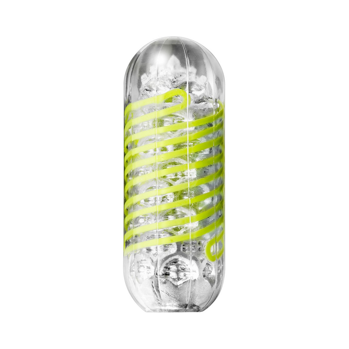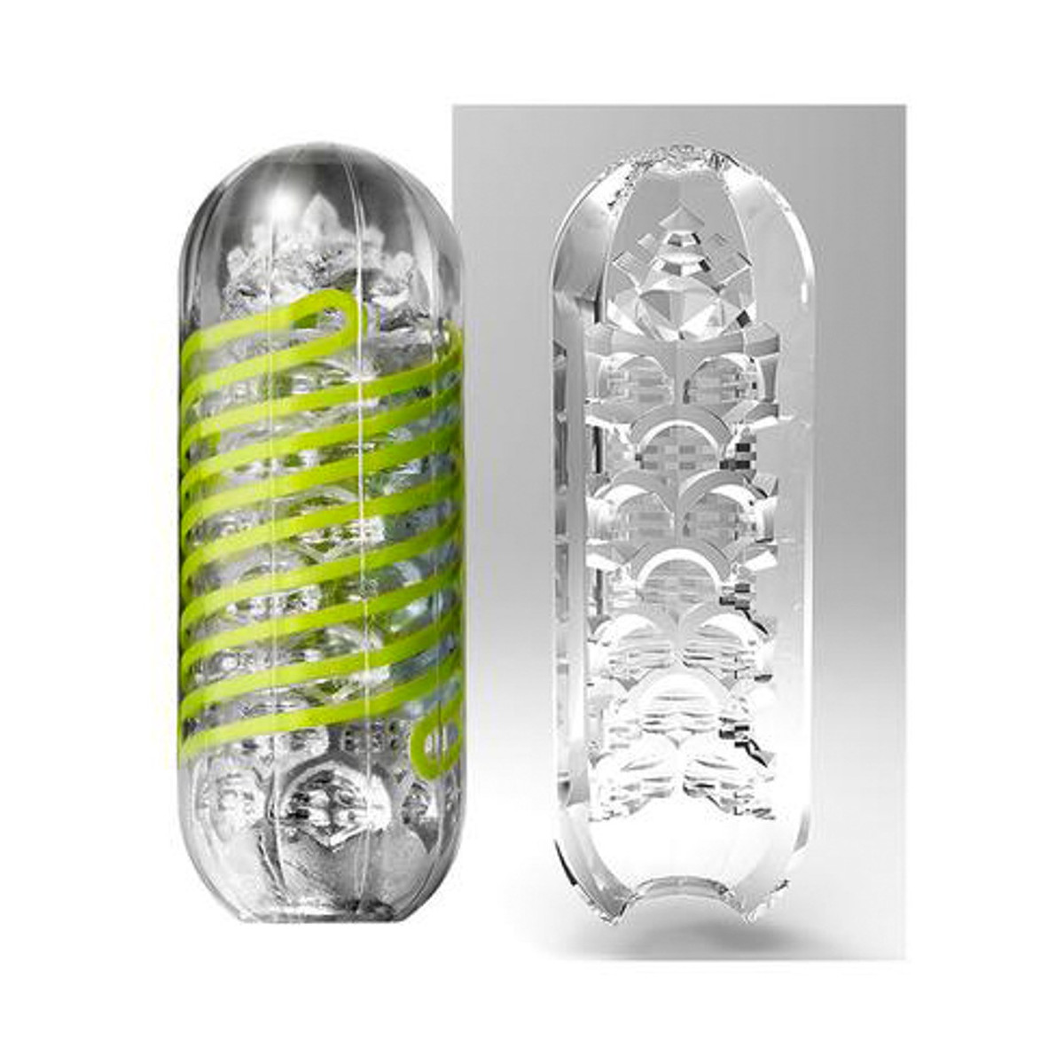 Spinner masturbatore trasparente e riutilizzabile di Tenga con bobina integrata che fa girare il masturbatore quando viene penetrato (meccanismo a bobina interna). Canale del piacere strutturato in modo distinto dagli stimoli.