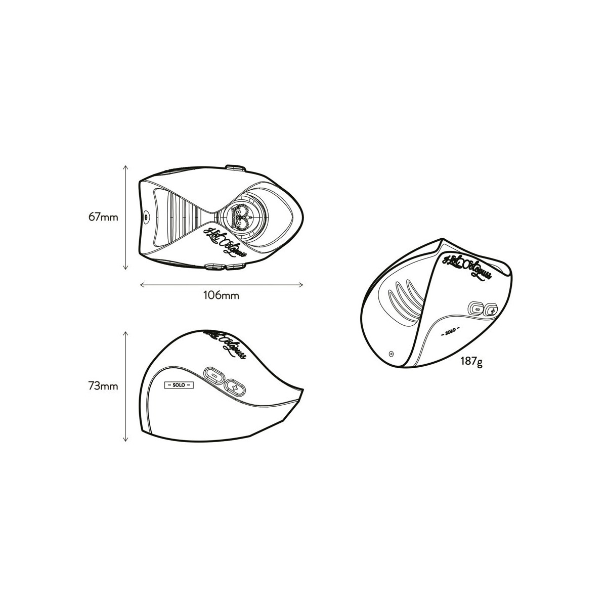 Lunghezza totale 10,6 cm, larghezza 6,7 cm, altezza 7,3 cm. ABS, silicone.