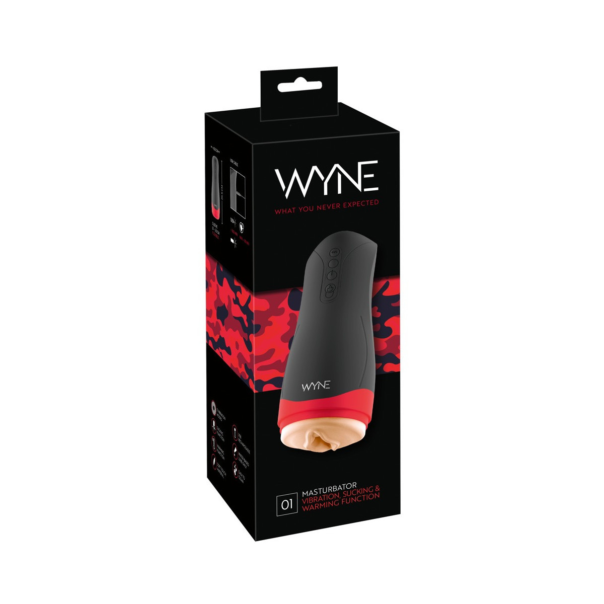 Pratico masturbatore 01 di WYNE con eccitante manicotto morbido e nodoso in vagina look all'interno. In più una funzione di calore fino a 42°C, 5 modalità di vibrazione varie in 3 velocità e una funzione di aspirazione intensiva in 3 modalità. Tutte le funzioni possono essere controllate separatamente o in combinazione al tocco di un pulsante direttamente sul giocattolo.