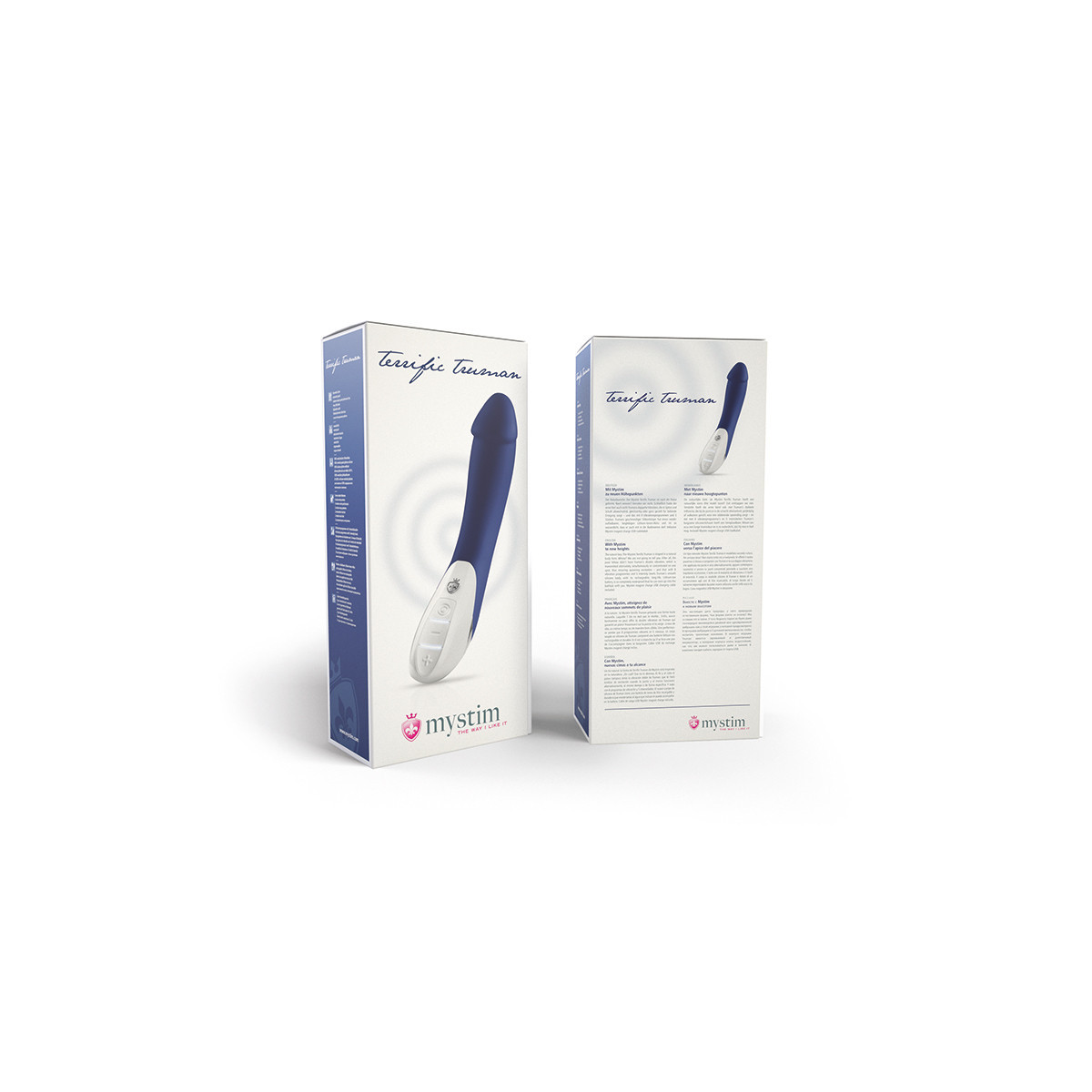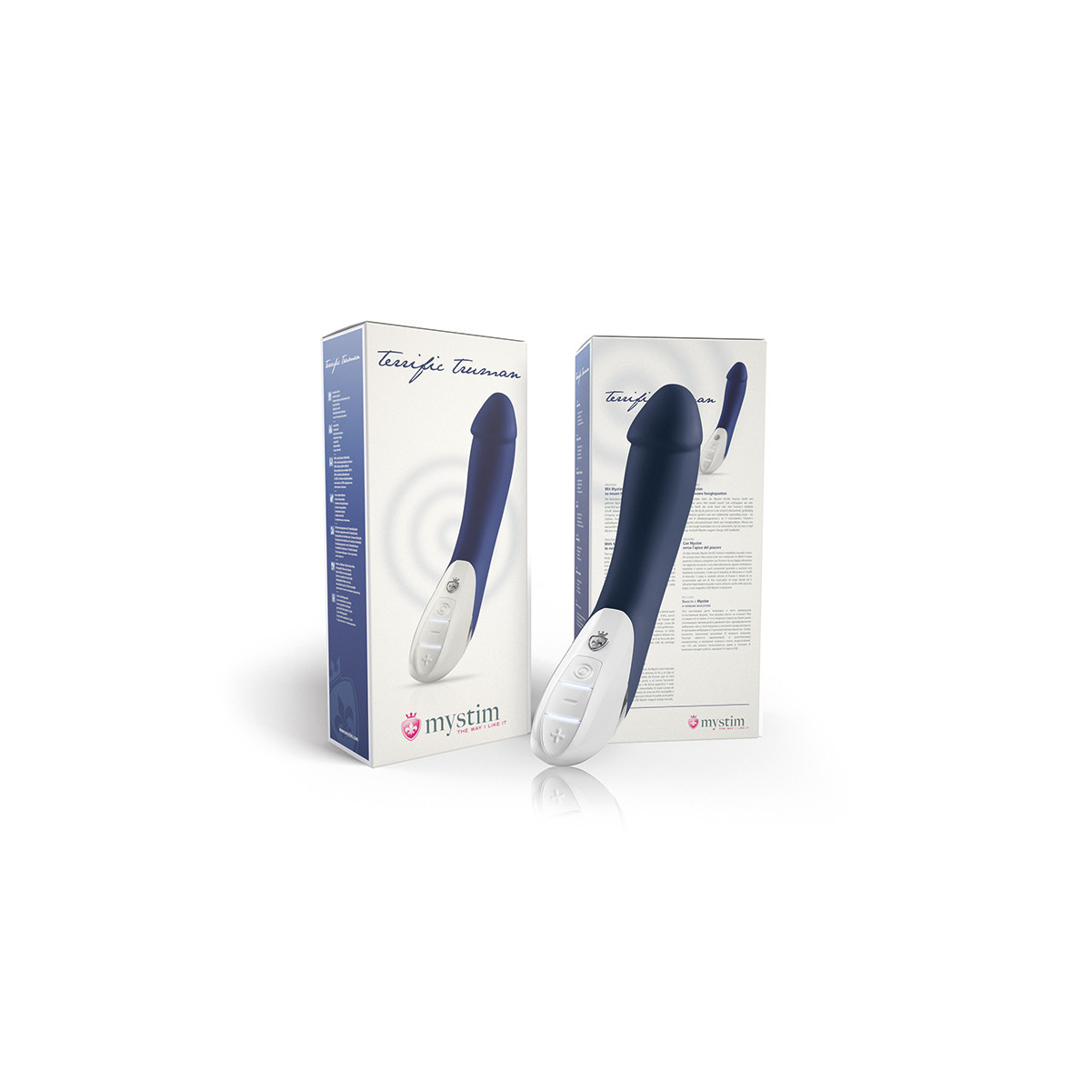 Mystim Terrific Truman. Tipo di prodotto: Vibratore a coniglio, Tipo di stimolazione: Stimolazione vaginale, Colore del prodotto: Blu. Tipo batteria: Batteria integrata, Tecnologia batteria: Ioni di Litio. Lunghezza: 270 mm, Diametro: 4,3 cm. Tipo di imballo: Scatola. Quantità per pacco: 1 pz