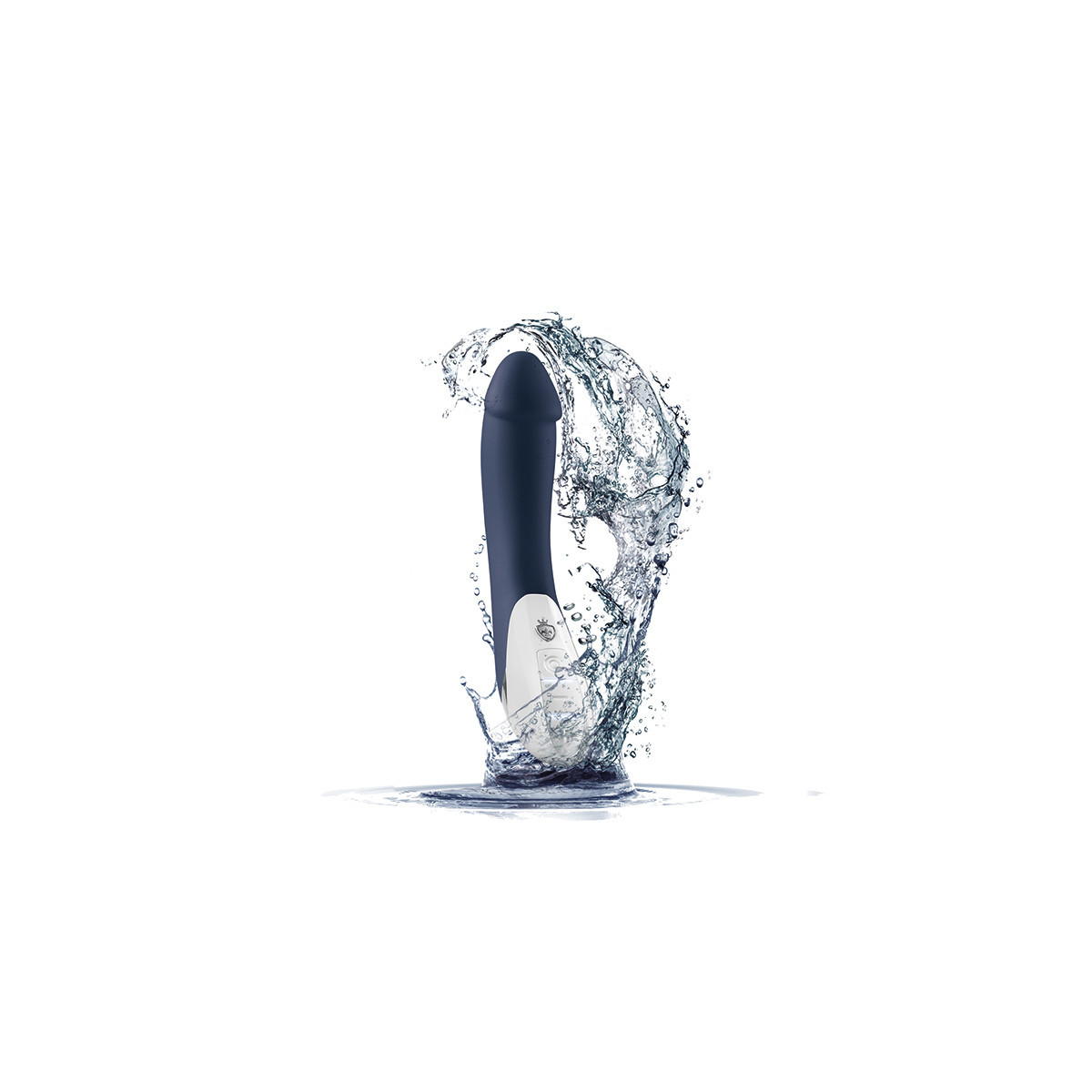 Vibratore a sussurro ricaricabile con 2 motori, 8 livelli di funzione e 5 velocità. Flessibile. Blu. Lunga circa 15 cm, Ø 3,5-4,3 cm. Materiale: silicone al platino, ABS. Incluso cavo di ricarica USB.