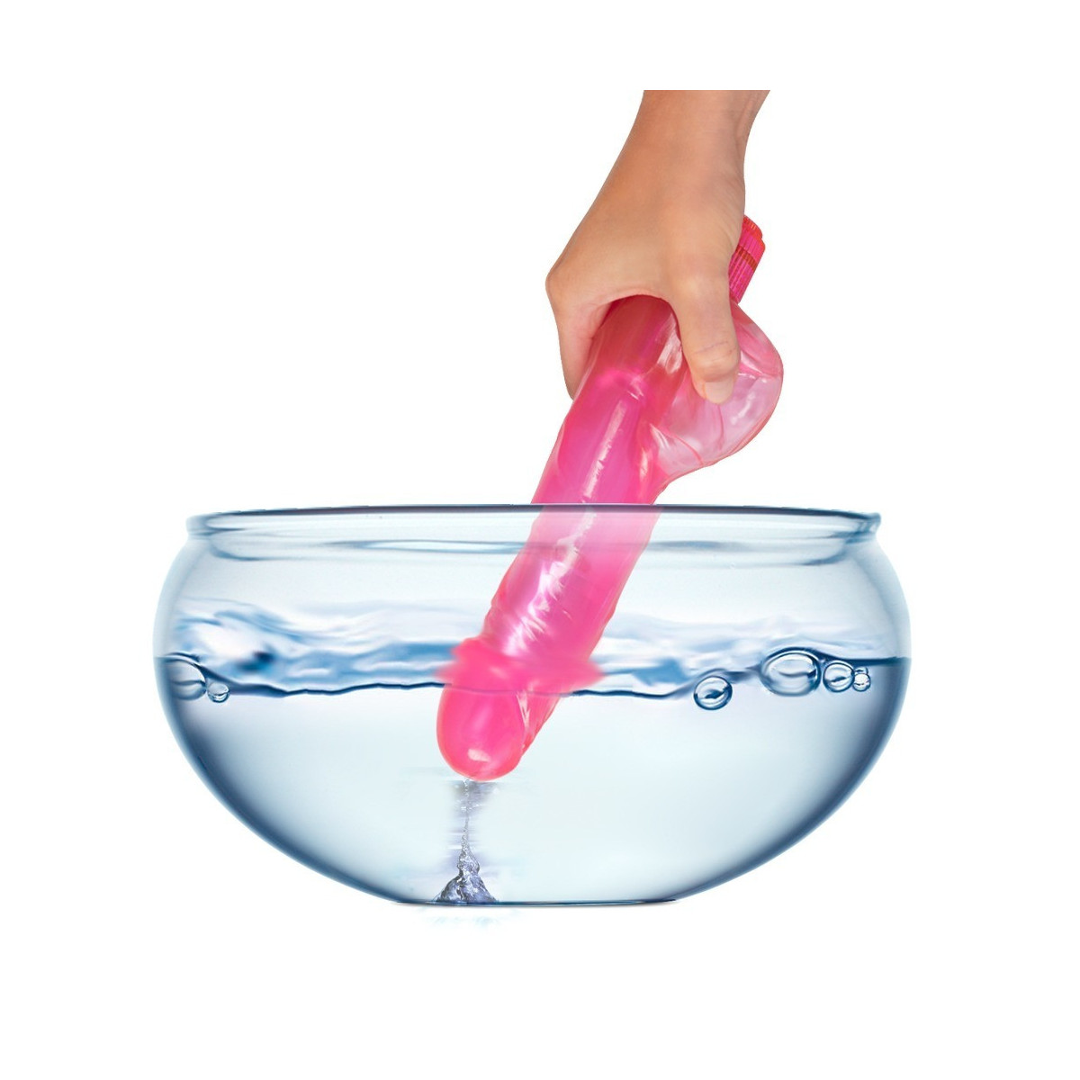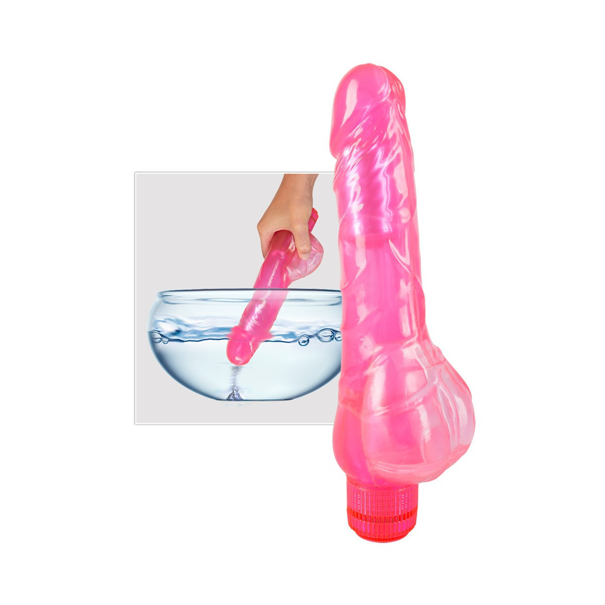Vibratore rosa che può assorbire il liquido e spruzzarlo via di nuovo dopo averlo premuto. Lunghezza totale 24,5 cm, profondità di inserimento circa 14 cm, Ø da 3,4 a 4,2 cm (asta), 6,8 cm (testicoli). Materiale: PVC, ABS. (Si prega di ordinare le batterie separatamente: 2 x Mignon/AA)