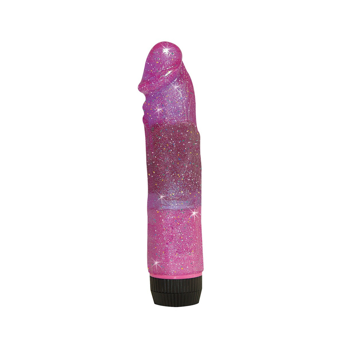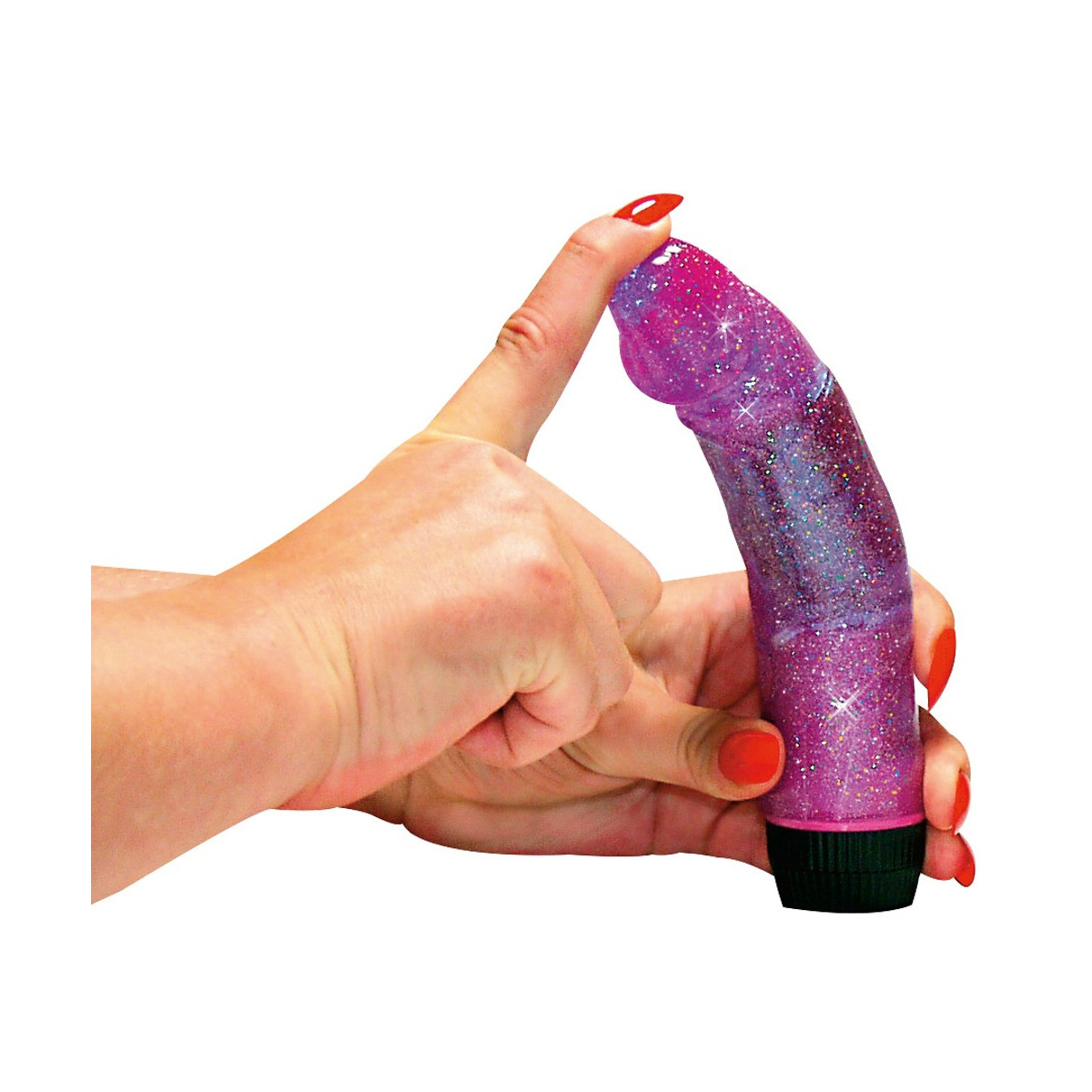 Molto flessibile. Con vibrazione a regolazione continua (estremamente silenzioso). Viola trasparente con glitter. Ca. 18,5 cm di lunghezza, Ø 3,5 cm. Materiale: PVC, ABS.