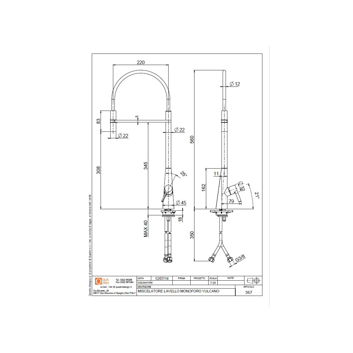 Quadrodesign 367 - Miscelatore Design, Acciaio Inox AISI316L, Canna Girevole, Flessibile Bianco