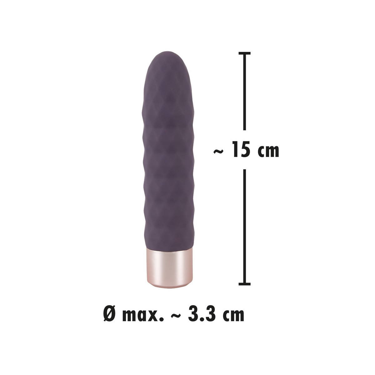 Lunghezza totale 15 cm, lunghezza di inserimento 12,5 cm, Ø 3,3 cm. Silicone, PU, ABS.