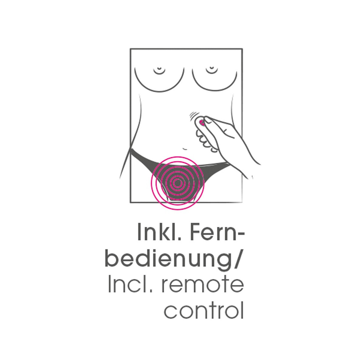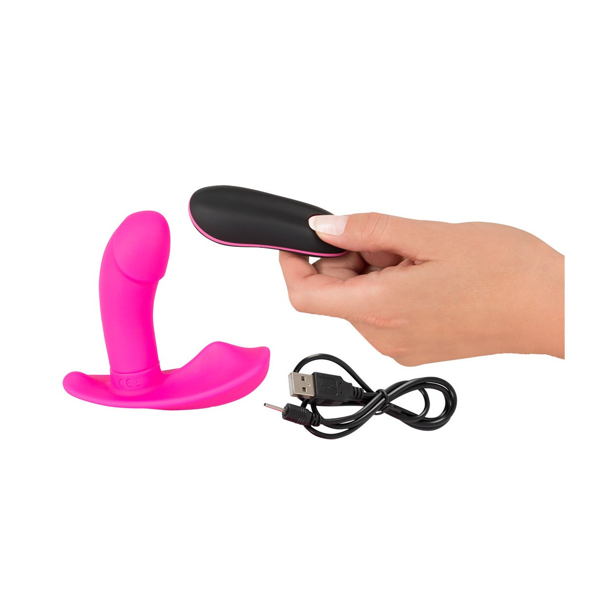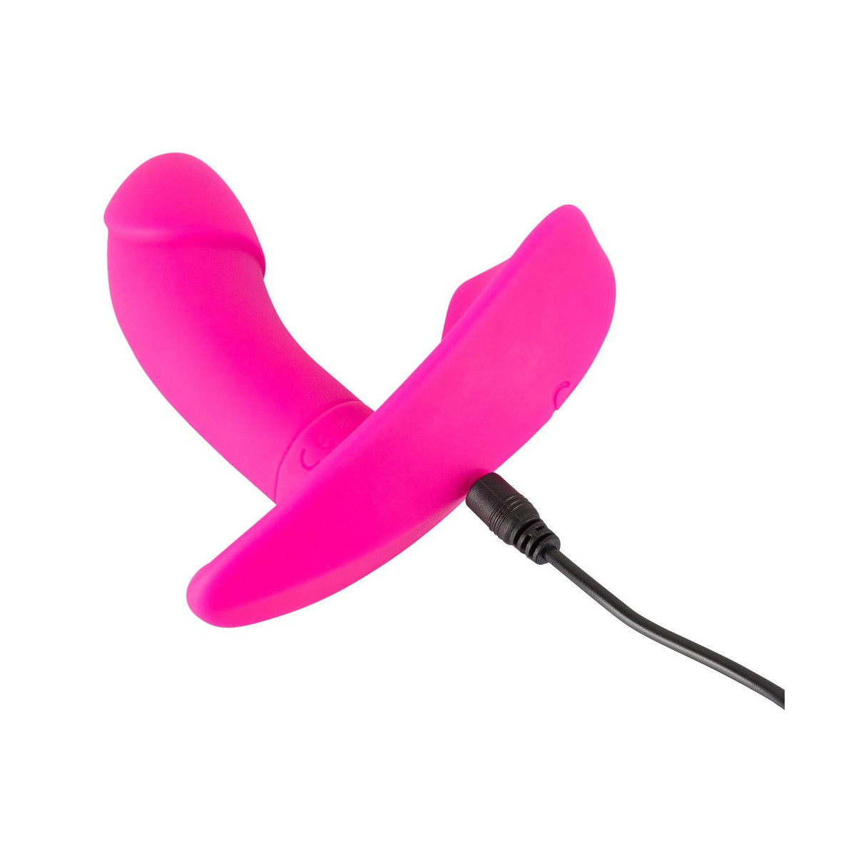 Vibratore a filigrana con superficie di contatto rialzata per le labbra e fusto a forma di pene con glande pronunciato. Stimola il clitoride, la vagina e il punto G contemporaneamente in 10 potenti modalità di vibrazione. Può essere indossato discretamente in mutandine. Controllabile con la semplice pressione di un tasto o di un telecomando. Ricaricabile con il cavo USB incluso. Batterie per il telecomando incluse.
