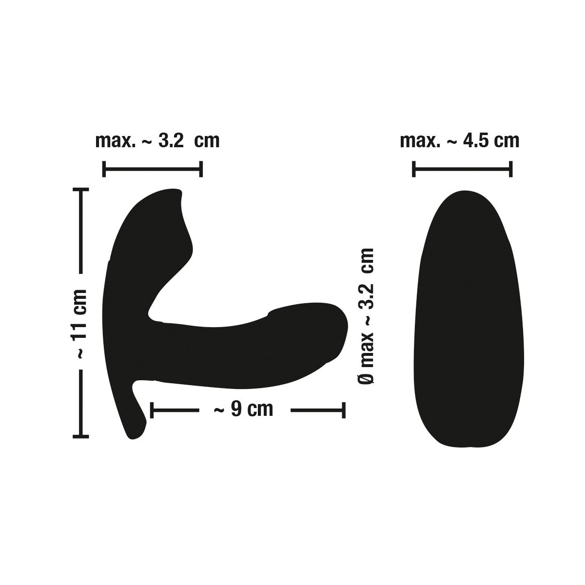 Superficie di appoggio lunga 10,7 cm, larga 4,5 cm, alta 3,2 cm; asta del vibratore lunga 9 cm, Ø 2,5-3,2 cm. Silicone, PU, ABS.