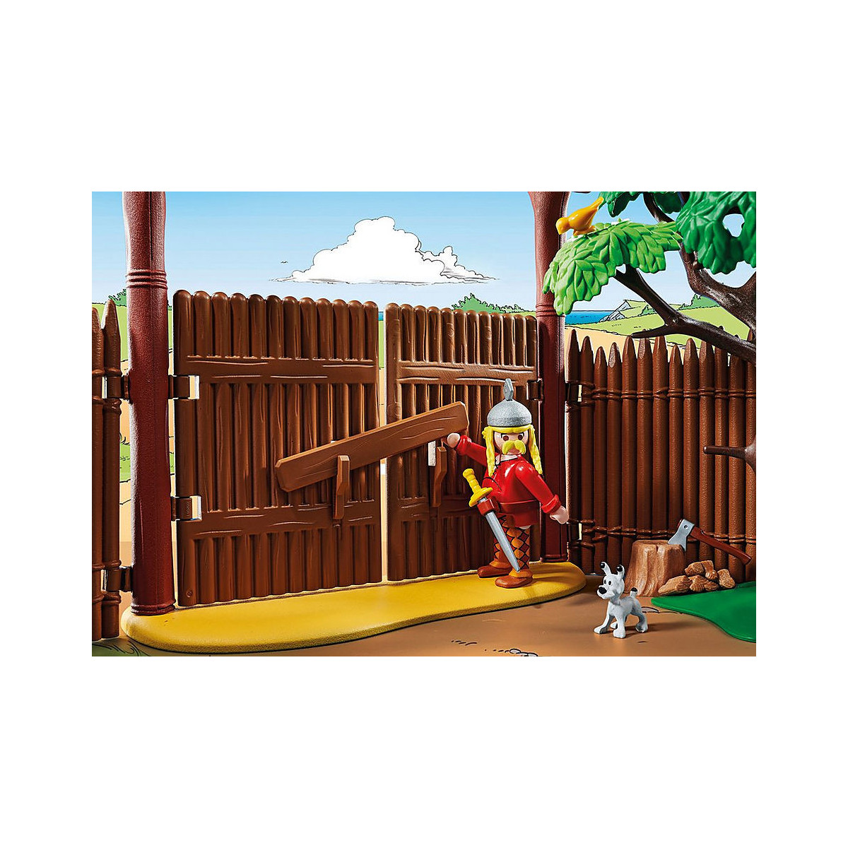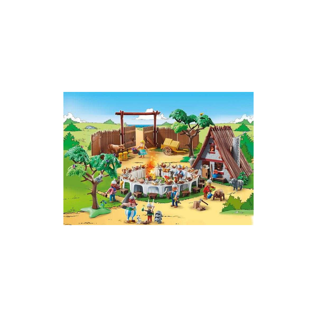 | Contenuto della confezione | Figures: Asterix, Obelix, 4 Gauls, 1 Gaulish woman Animals: Dogmatix, 1 wild boar, 1 cow, 2 squirrels, 1 owl, 1 bird, 4 fishes; Accessories: Asterix hut, 4 palisades, 1 gate, 1 fence element, 1 wagon, 6 tables, 1 fireplace, 1 fireplace with spit, 1 menhir, 18 stools, 18 drinking cups, 1 stool, 1 bed, 1 pillow, 1 wooden table, 1 cooking place, 1 set of pans, 1 broom, 1 bench, 3 Roman helmets, 1 chopping block, 1 axe, 4 clay jugs, 1 stretcher, 5 logs, 1 pot, 2 straw bales, 2 straw-bound, 4 fish bones, 7 bones, 6 hams, 2 roast boars, 1 loaf of bread, 1 alehouse, 1 vase, 5 meat with bones, 4 plates with handle, 4 plates, 4 large bowls, 4 medium bowls, 4 small bowls, 1 stand plate,1 basket, 2 bouquets of flowers, 4 roses, 1 flower bush, 2 trees, 1 Asterix helmet with wings, 1 water bottle, 1 dagger, 2 belts, 2 helmets with horns, 3 Gaul helmets, 2 bows, 4 cuffs, 1 belt loop, 2 swords |
