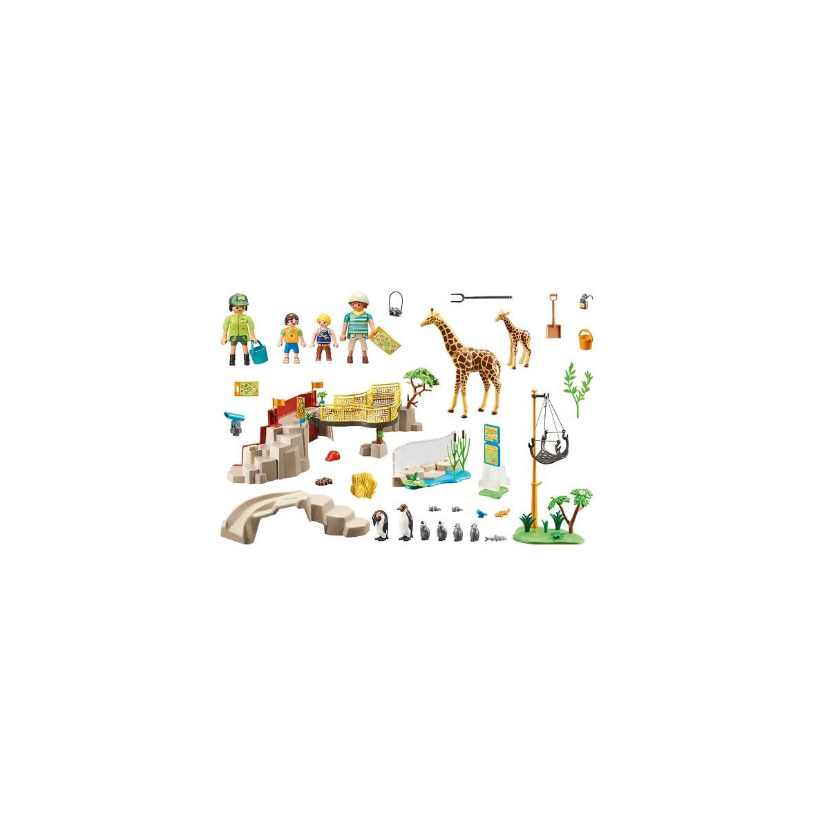 | Contenuto della confezione | Figures: 1 man, 1 woman, 1 girl, 1 boy; Animals: 1 giraffe, 1 baby giraffe, 2 penguins, 4 baby penguins, 4 pegs, 2 mice, 1 lizard, 1 bird; Accessories: 1 entrance gate with stairway and observation path with 2 flags and information board, 1 large rock with tree, 2 demarcation elements moat with water plants and glass wall, 1 green area with tree and pole with giraffe food basket, 1 penguin rock large with slide, 1 camera, 1 telescope, 1 display board with clock, 4 site plans, 1 bucket large with food insert, 2 plant pots with plants, 1 shovel, 1 pitchfork, 1 cap, 1 visor cap |