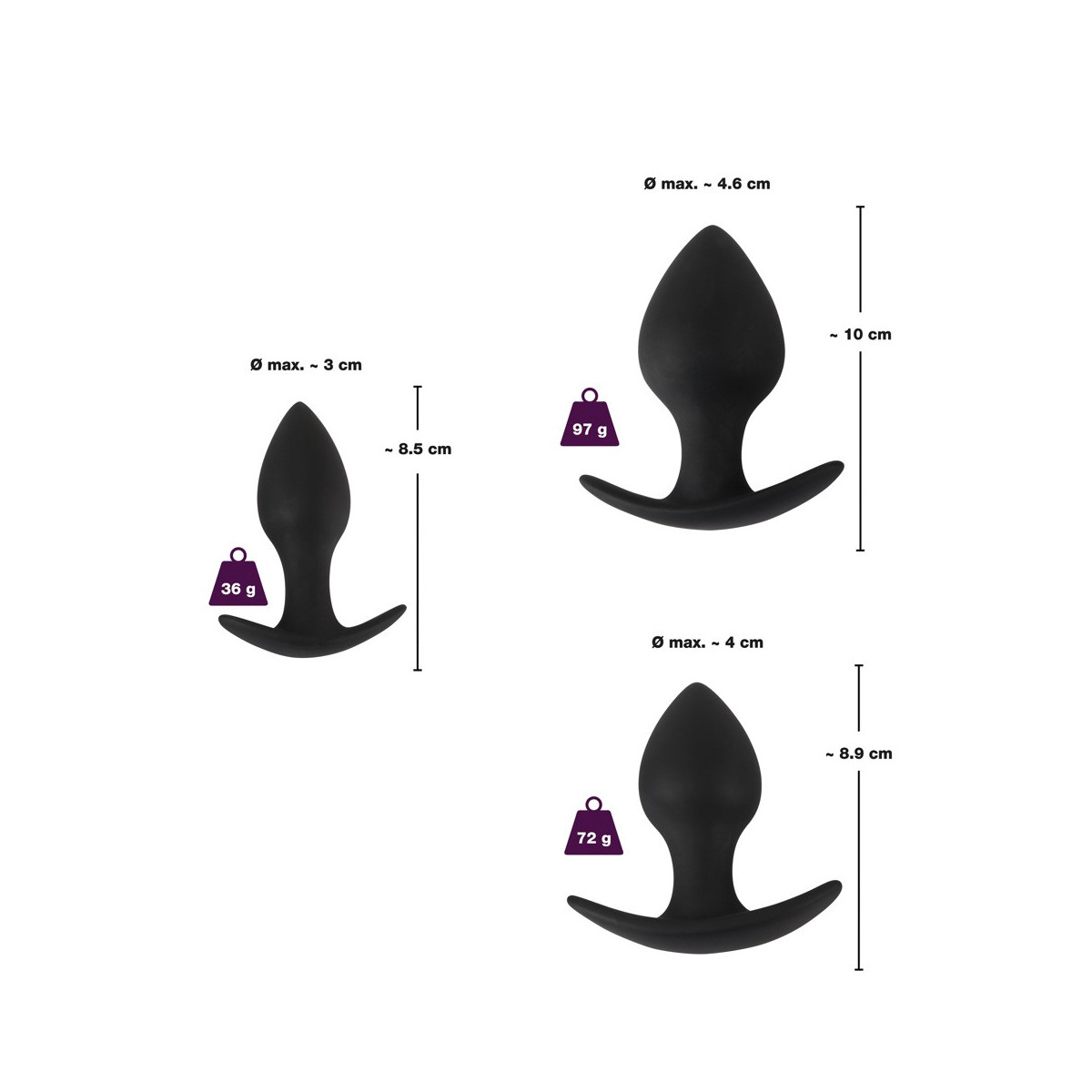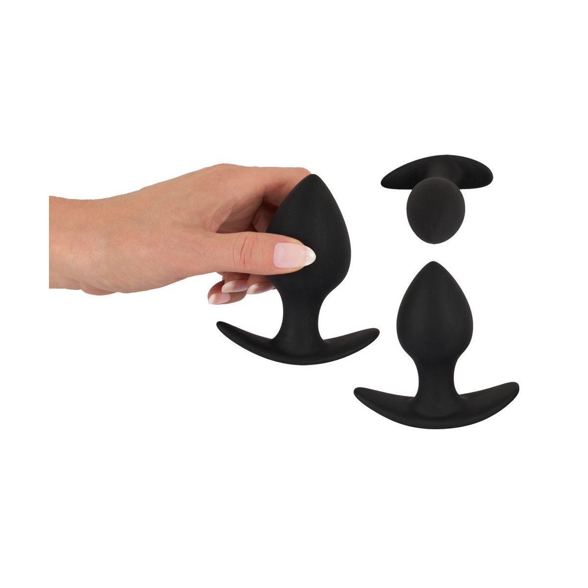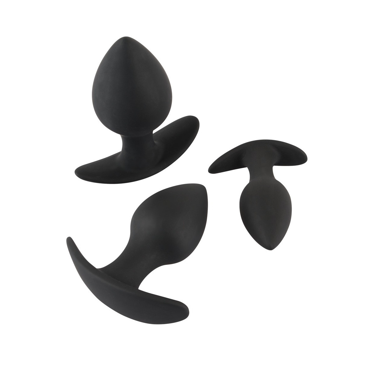 Set di tappi anale in 3 pezzi con struttura piacevolmente morbida. Le diverse misure sono perfette per un allenamento anale graduale. Grazie alla loro forma conica, gli spinotti sono particolarmente facili da inserire e offrono una piacevole sensazione di pienezza. Con base extra larga per una presa sicura e una facile manipolazione.