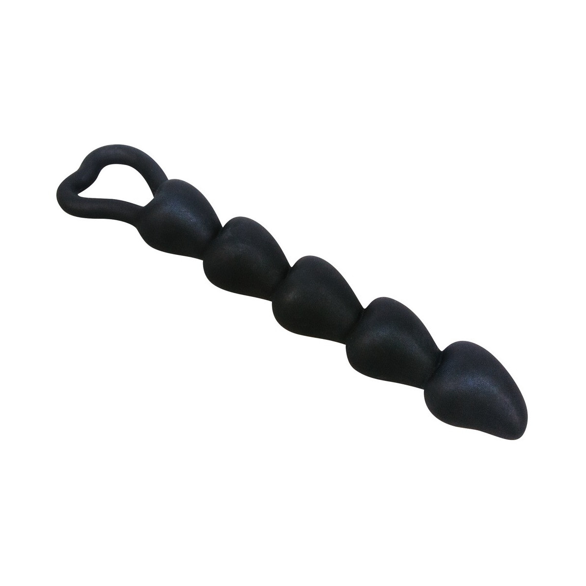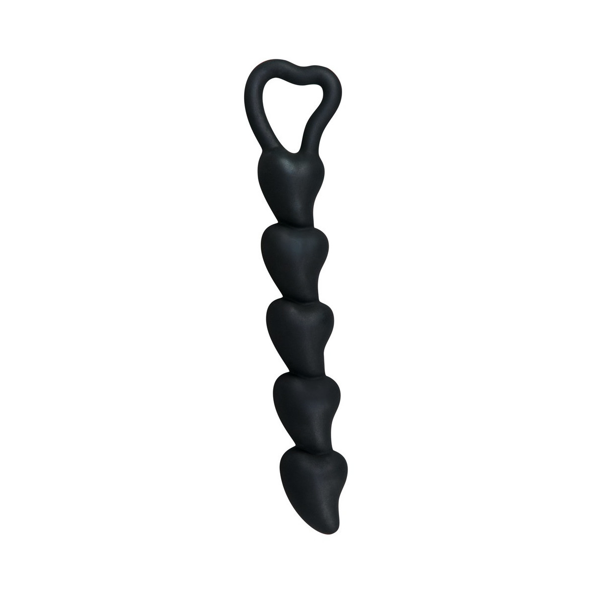 Vellutata morbida corda anale di cinque palline a forma di cuore e un anello di ritorno. Nero. Lunghezza totale 18,5 cm, profondità di inserimento 15 cm. Ø da 1,3 a 2,6 cm. Materiale: silicone.
