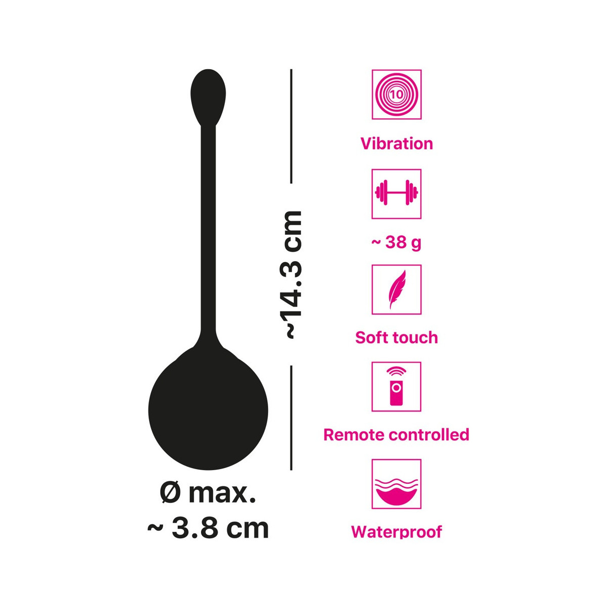 Con un peso di 38 g, questa palla vibrante è perfetta per un allenamento vaginale iniziale. Realizzata in silicone skin-friendly con una texture morbida e setosa al tatto, la palla è facile da inserire e fornisce il massimo comfort per l'allenamento/le coccole.