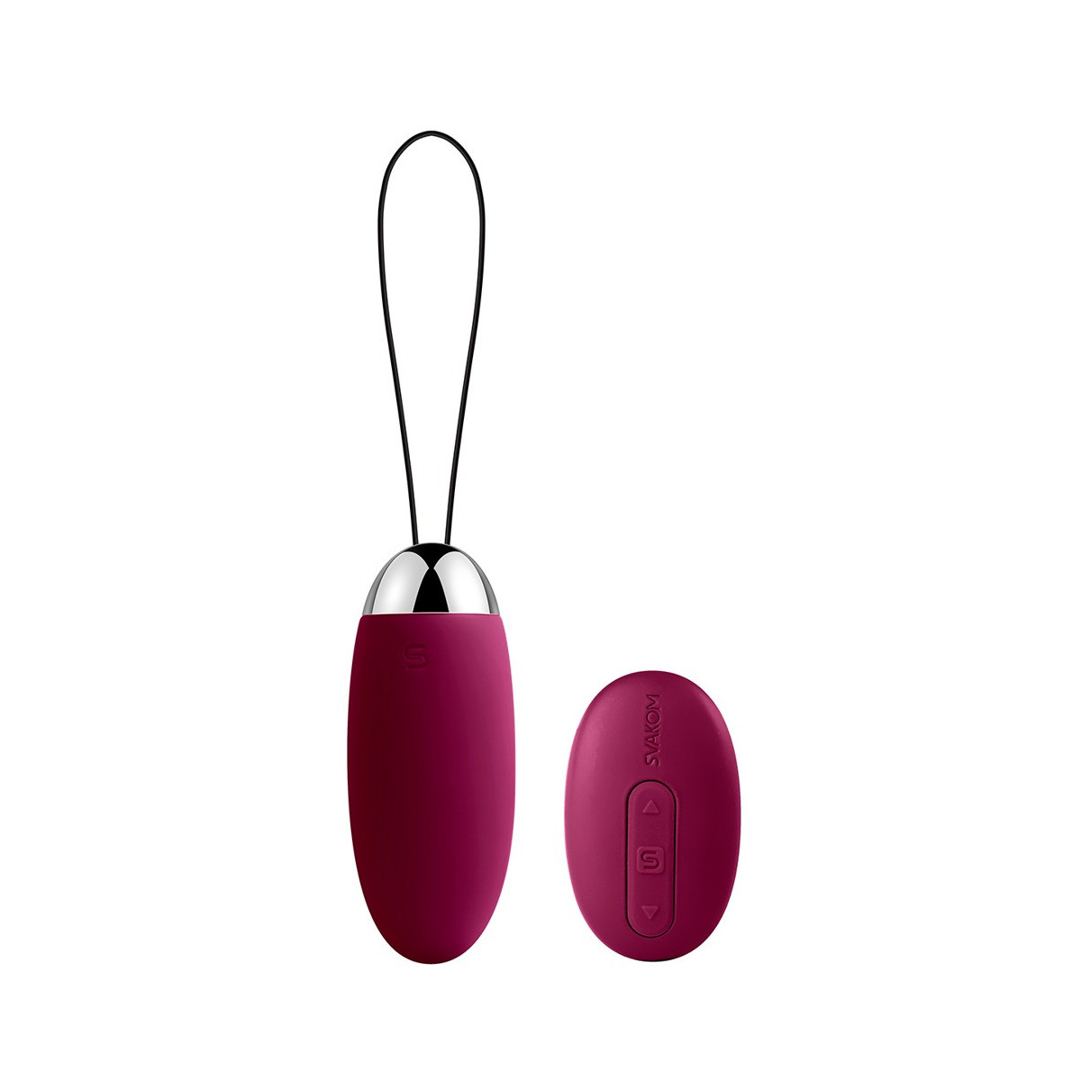 Ricaricabile, impermeabile vibro uovo vibro con texture morbida al tatto setosa e morbida al tatto, compreso il cinturino di recupero. Con 5 modalità di vibrazione silenziosa in 5 diverse intensità ciascuna. La modalità intelligente SVAKOM supplementare imita le frequenze di vibrazione dei rapporti sessuali fino all'orgasmo. Controllabile con la semplice pressione di un tasto o con il telecomando in dotazione. Include custodia, cavo di ricarica USB e batterie per il telecomando Lunghezza totale 17,6 cm (compreso il cinturino di recupero), lunghezza uovo vibro 8,1 cm, Ø 3,2 cm. Silicone con rivestimento in PU, ABS.