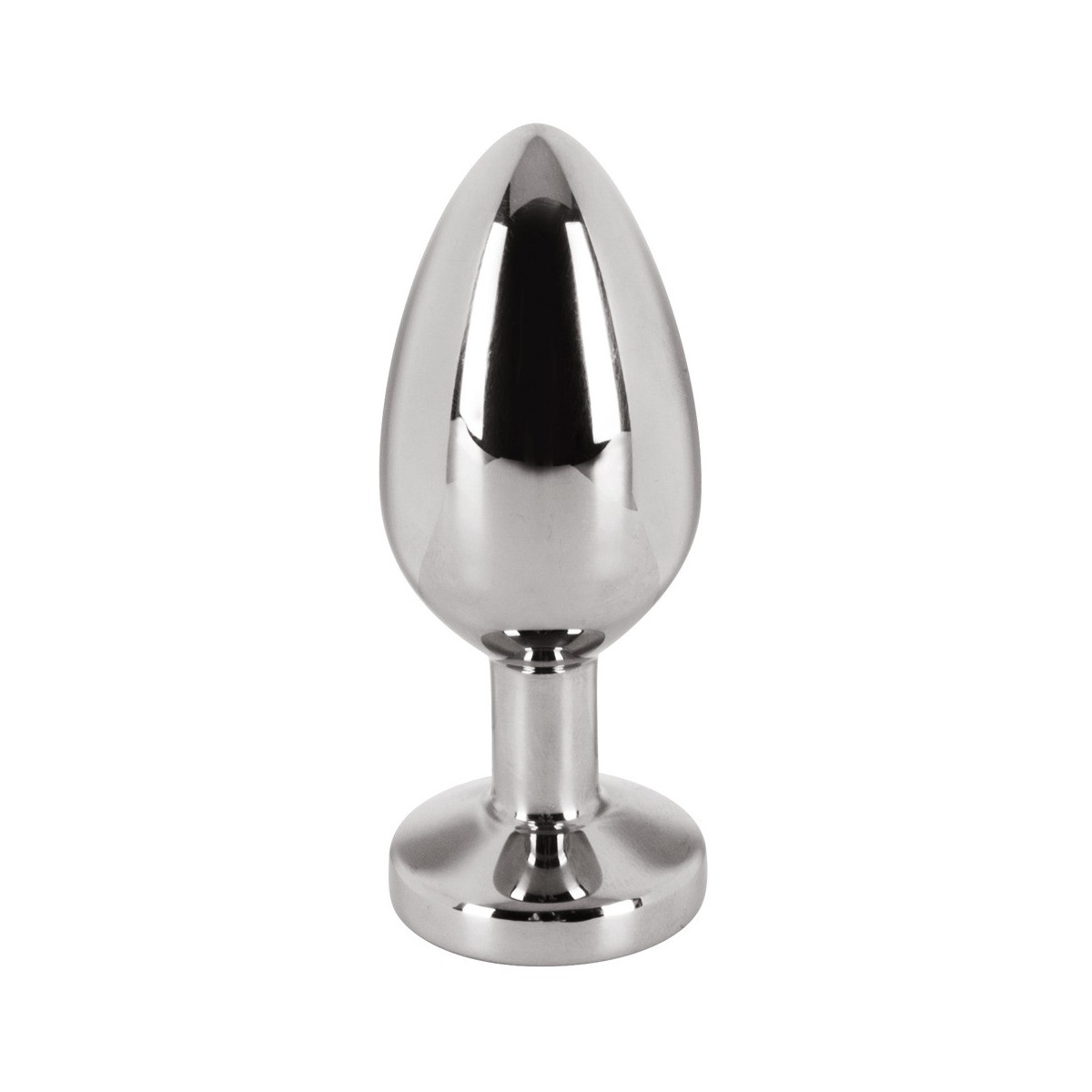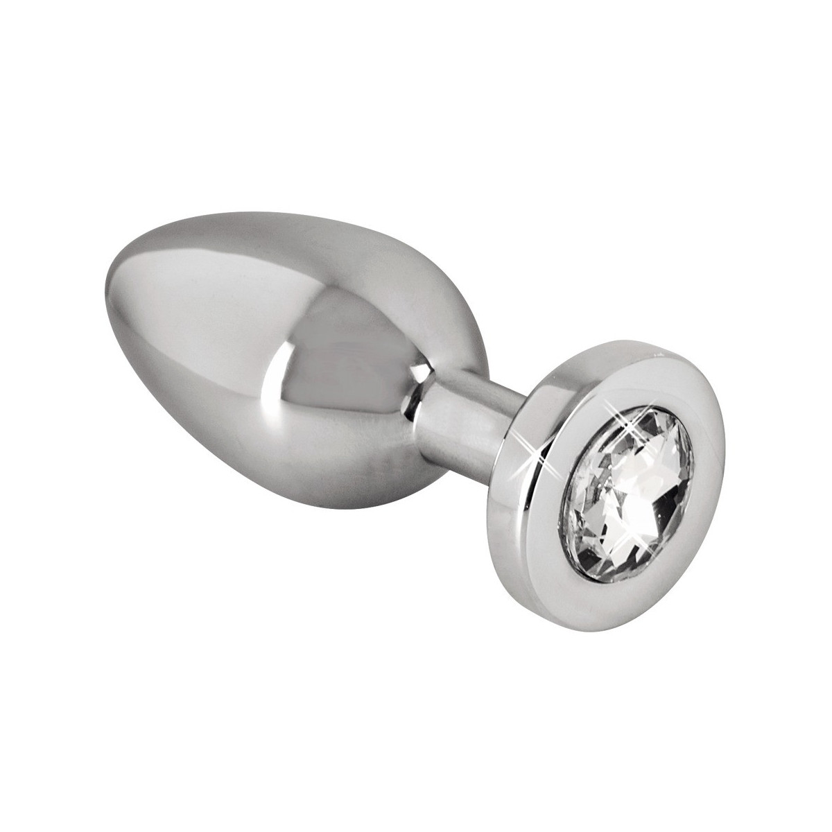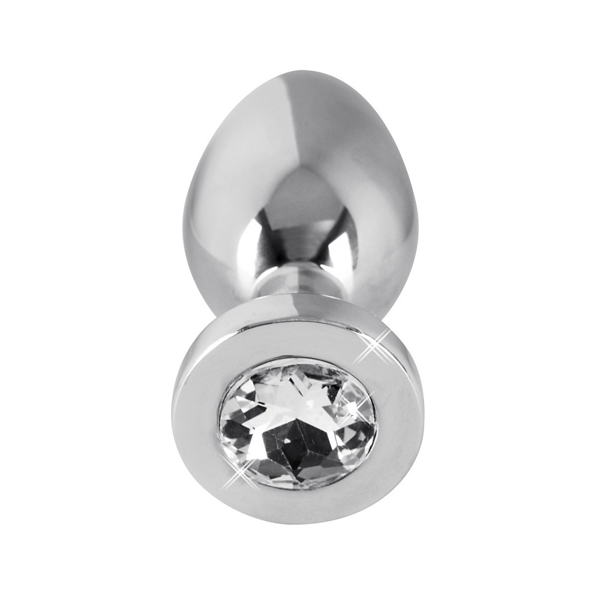 Plug anale di colore argento, di forma conica, con gemma chiara all'estremità. Lunghezza totale 6 cm, Ø 2,5 cm. Peso: 122 g. Materiale: acciaio inossidabile, vetro acrilico (pietra).
