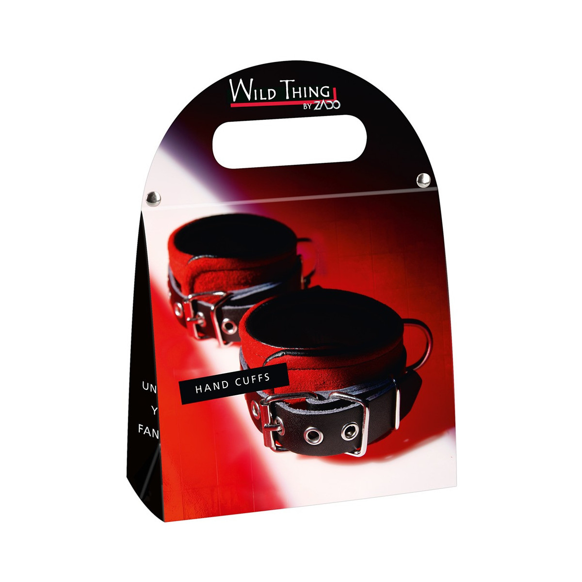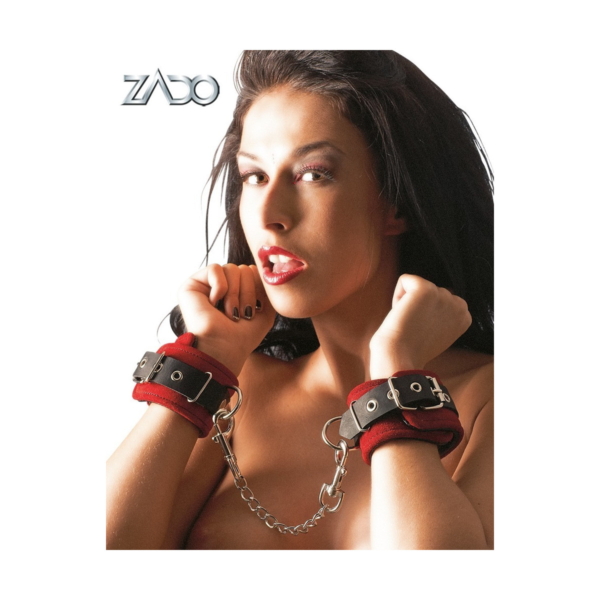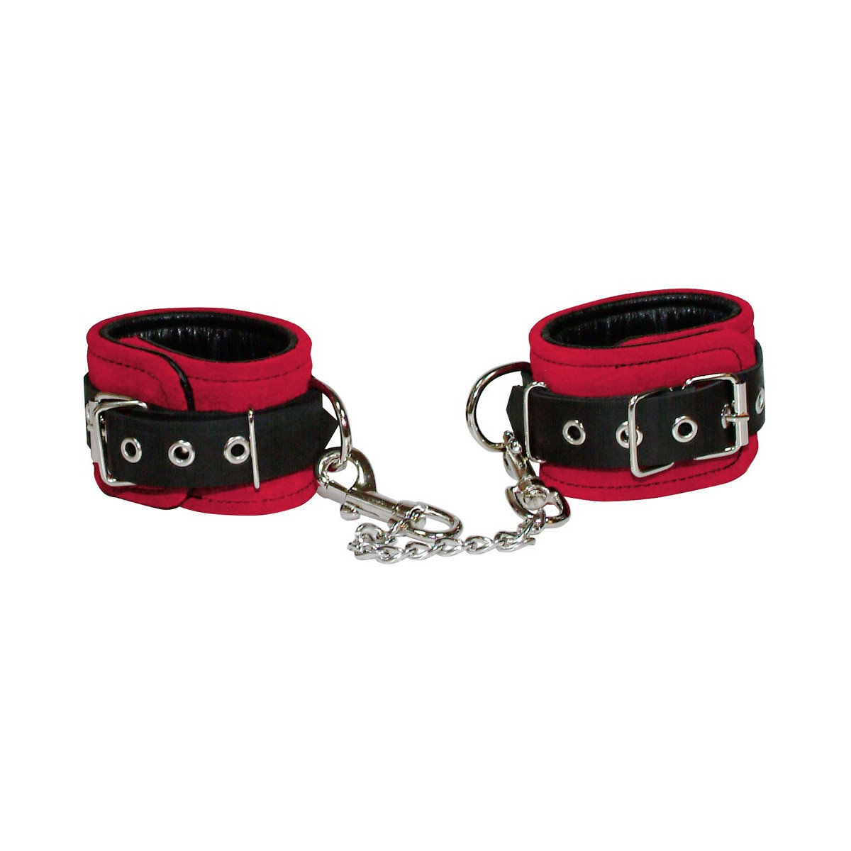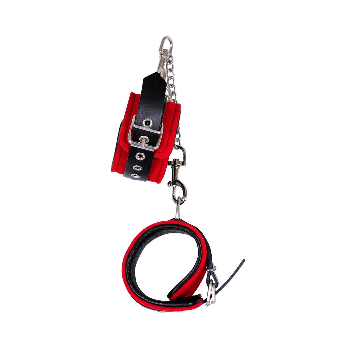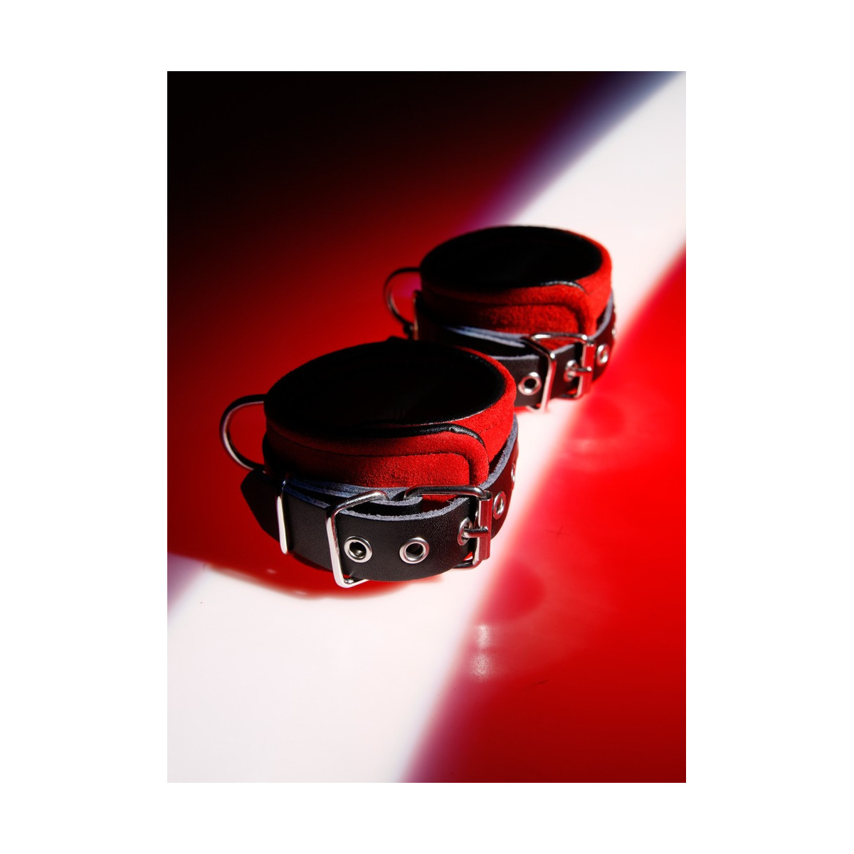 Due manicotti larghi 5,5 cm, finemente lavorati, collegati con una catena metallica removibile lunga 24 cm con due moschettoni. Circonferenza regolabile con chiusura a fibbia. Pelle velour rossa esternamente, pelle liscia nera internamente.