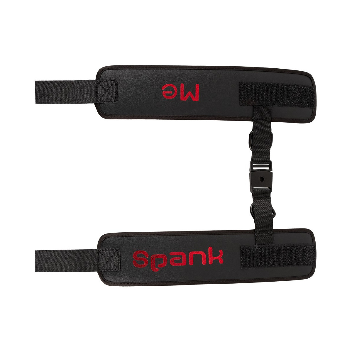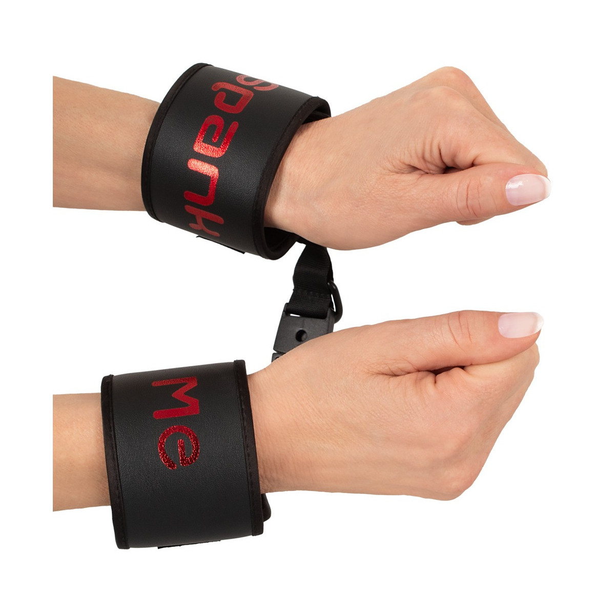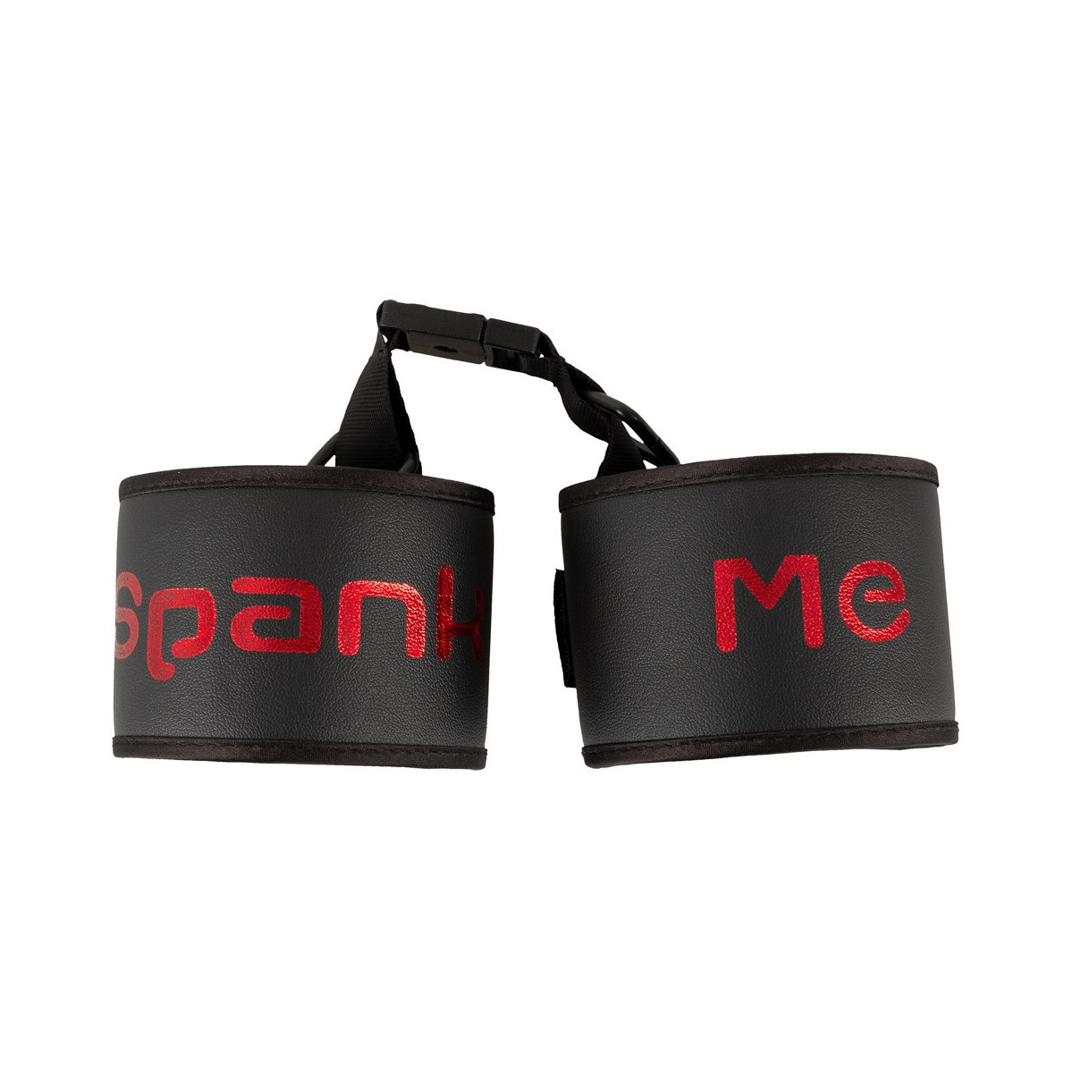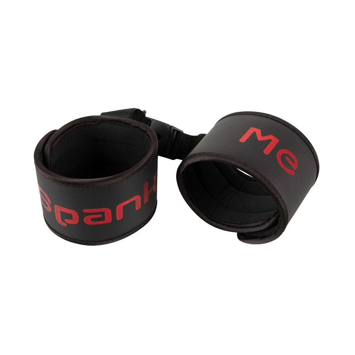 Manette morbide Spank me-Cuffs di Bad Kitty collegate da una fascia corta intrecciata con pratica chiusura a clip. In nero con scritta Spank me in rosso. Polsini regolabili in circonferenza con chiusura in velcro e veloci da mettere e togliere.