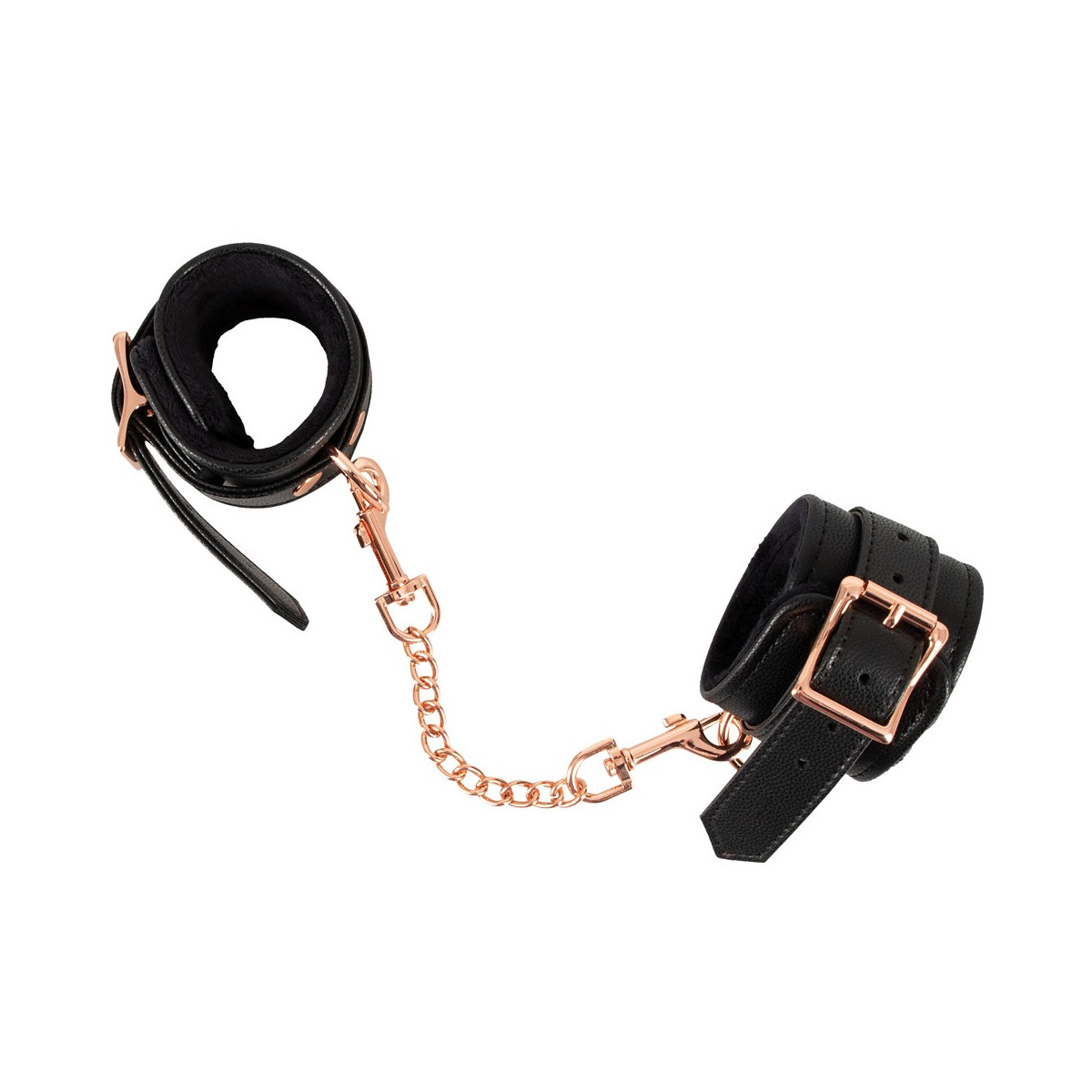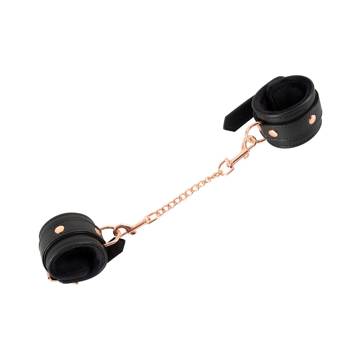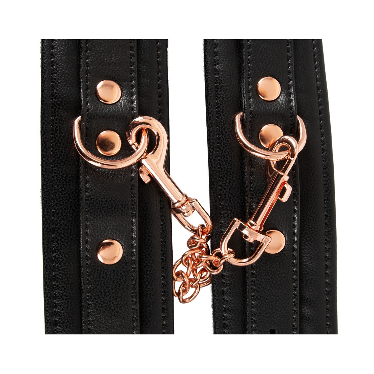 Il classico in un nobile look elegante! Manette robuste e di alta qualità di Bad Kitty in elegante look di pelle con catena di collegamento ed elementi di metallo in color oro rosa brillante. Polsini foderati di morbido peluche all'interno e ciascuno con un anello per attaccare la catena di collegamento a moschettone in dotazione. Ognuno regolabile in circonferenza da 15 cm a 21 cm con chiusura a fibbia. Catena di collegamento con 2 moschettoni lunghi 22 cm. Poliuretano, metallo; interno 100% poliestere.