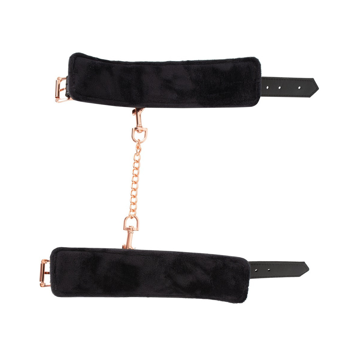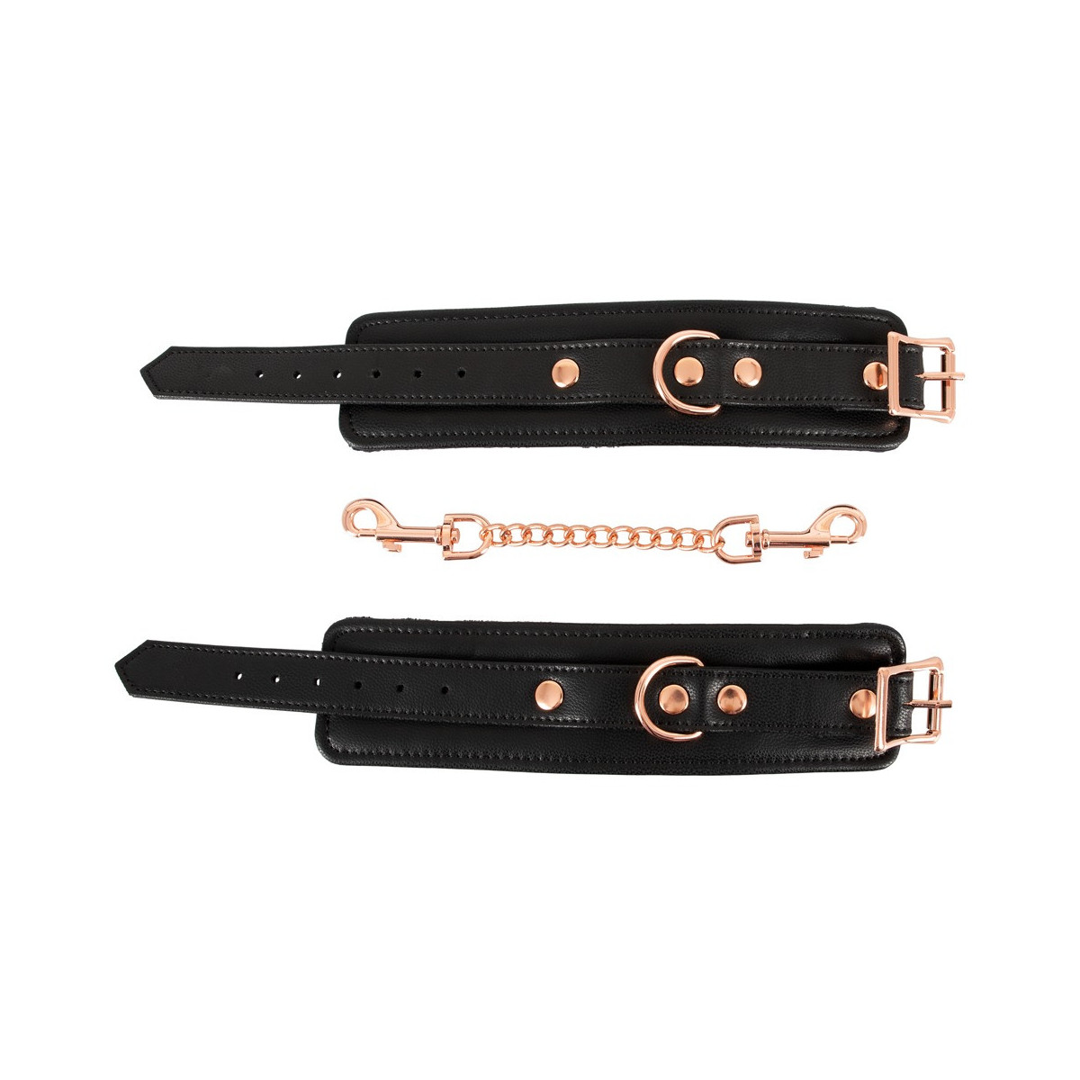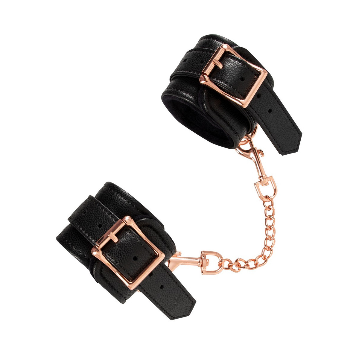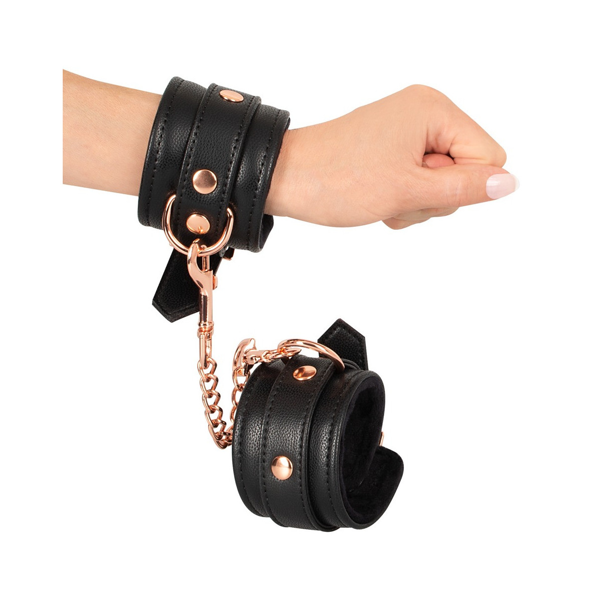 Il classico in un nobile look elegante! Manette robuste e di alta qualità di Bad Kitty in elegante look di pelle con catena di collegamento ed elementi di metallo in color oro rosa brillante. Polsini foderati di morbido peluche all'interno e ciascuno con un anello per attaccare la catena di collegamento a moschettone in dotazione. Ognuno regolabile in circonferenza da 15 cm a 21 cm con chiusura a fibbia. Catena di collegamento con 2 moschettoni lunghi 22 cm. Poliuretano, metallo; interno 100% poliestere.