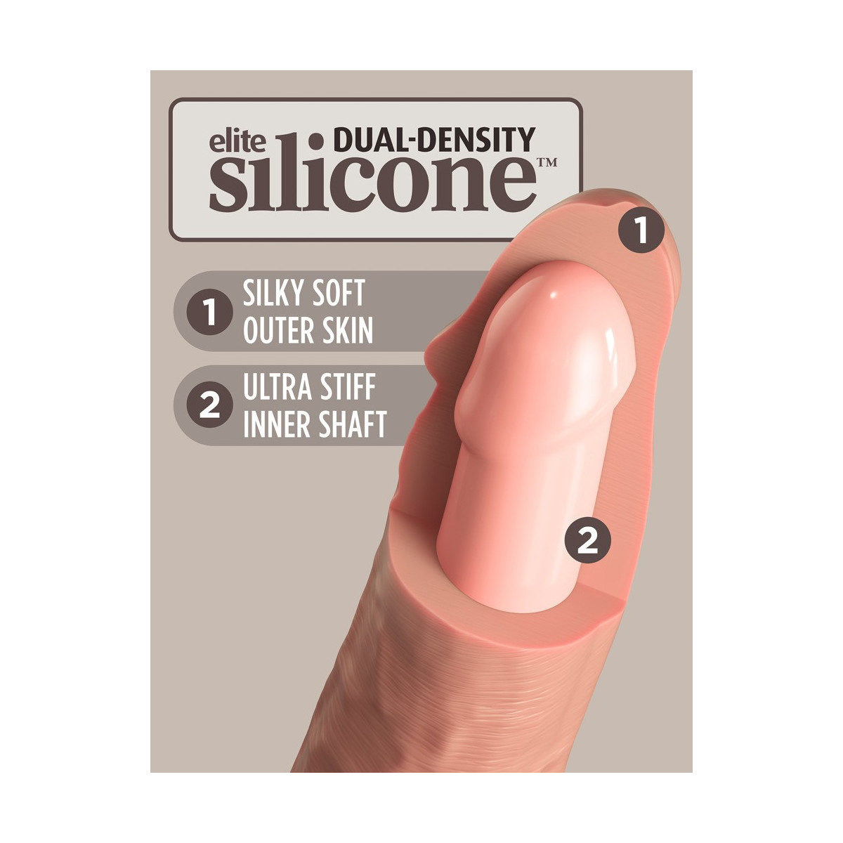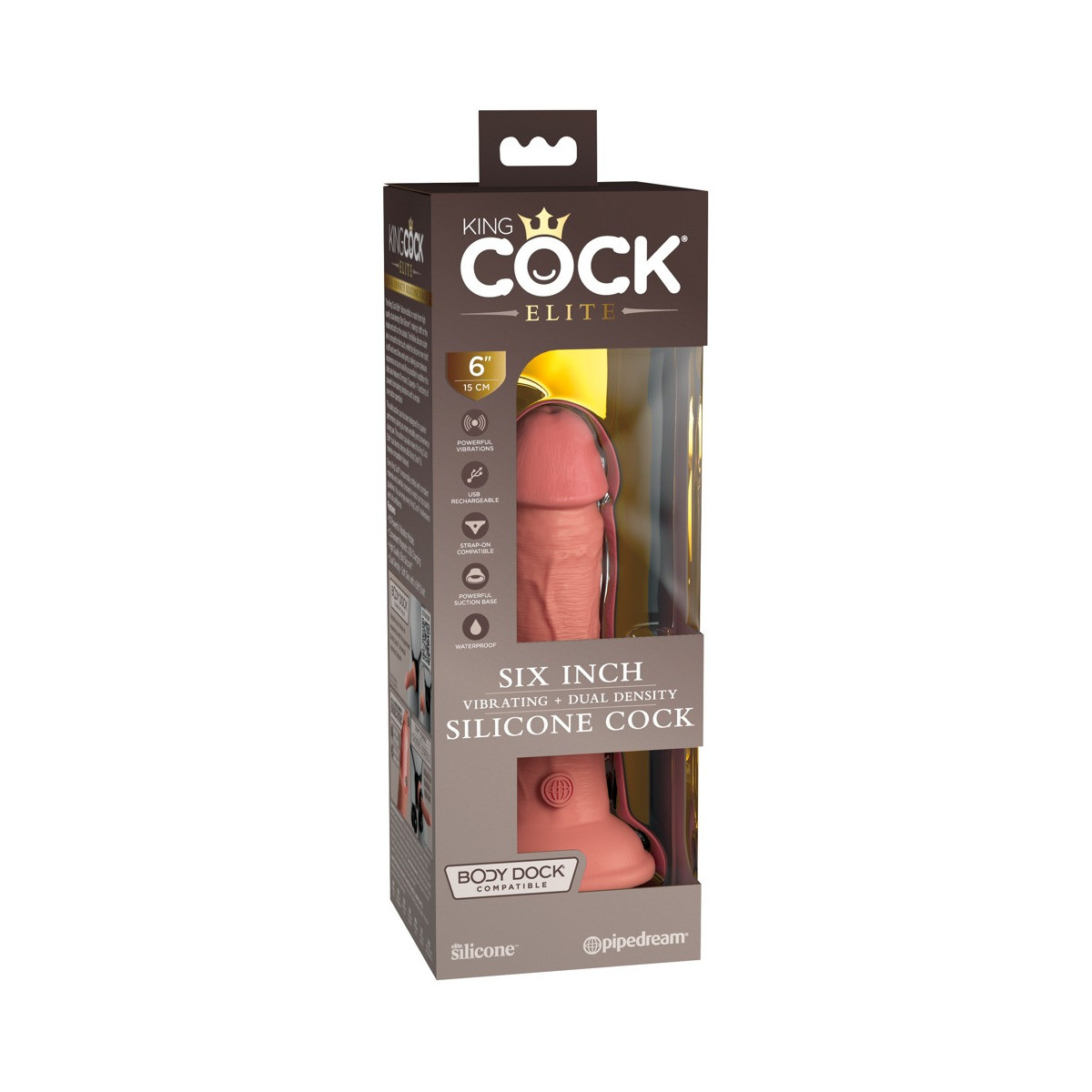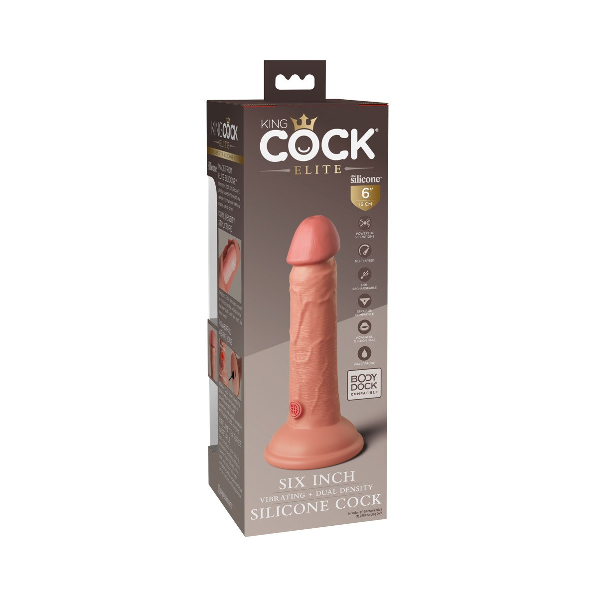 Vibratore naturale ricaricabile 6" vibrante + Dual Density Silicone Cock di King Cock Elite in look iper-realistico del pene fatto di materiale siliconico a doppia densità che si sente come la vera pelle. Il vibratore stesso (come un vero membro eretto) ha un'asta ferma, ma flessibile che rende l'esperienza di piacere il più realistica possibile.
