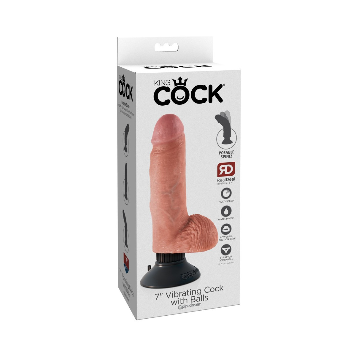 King Cock 7" Vibrating Cock with Balls - Vibratore Realistico con Testicoli, Ventosa, Impermeabile, Richiede Batterie