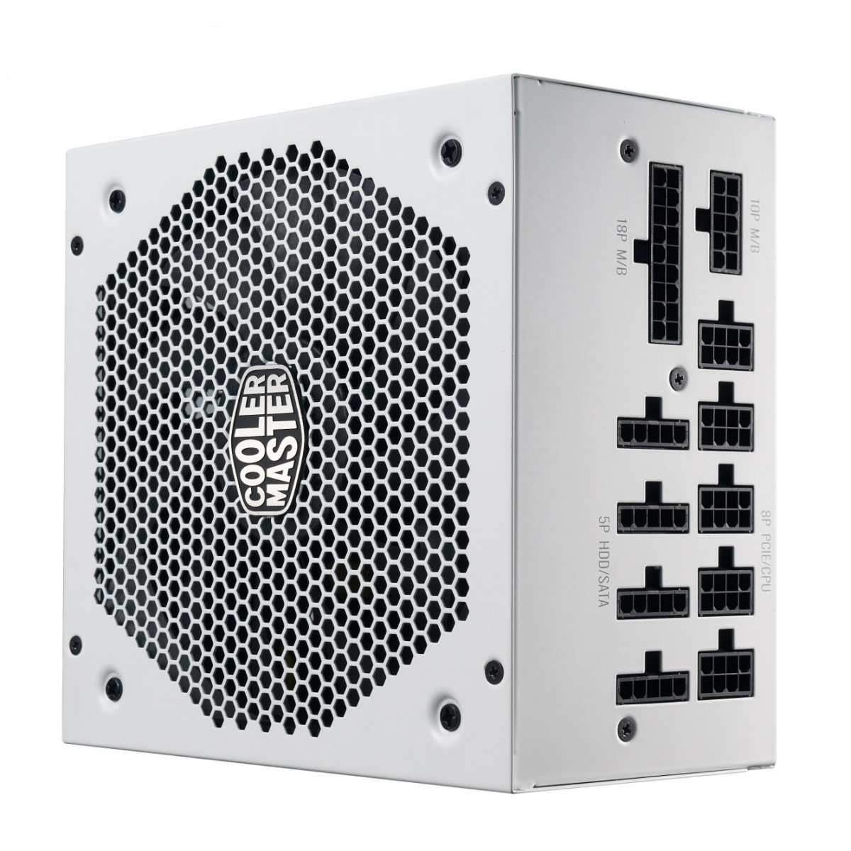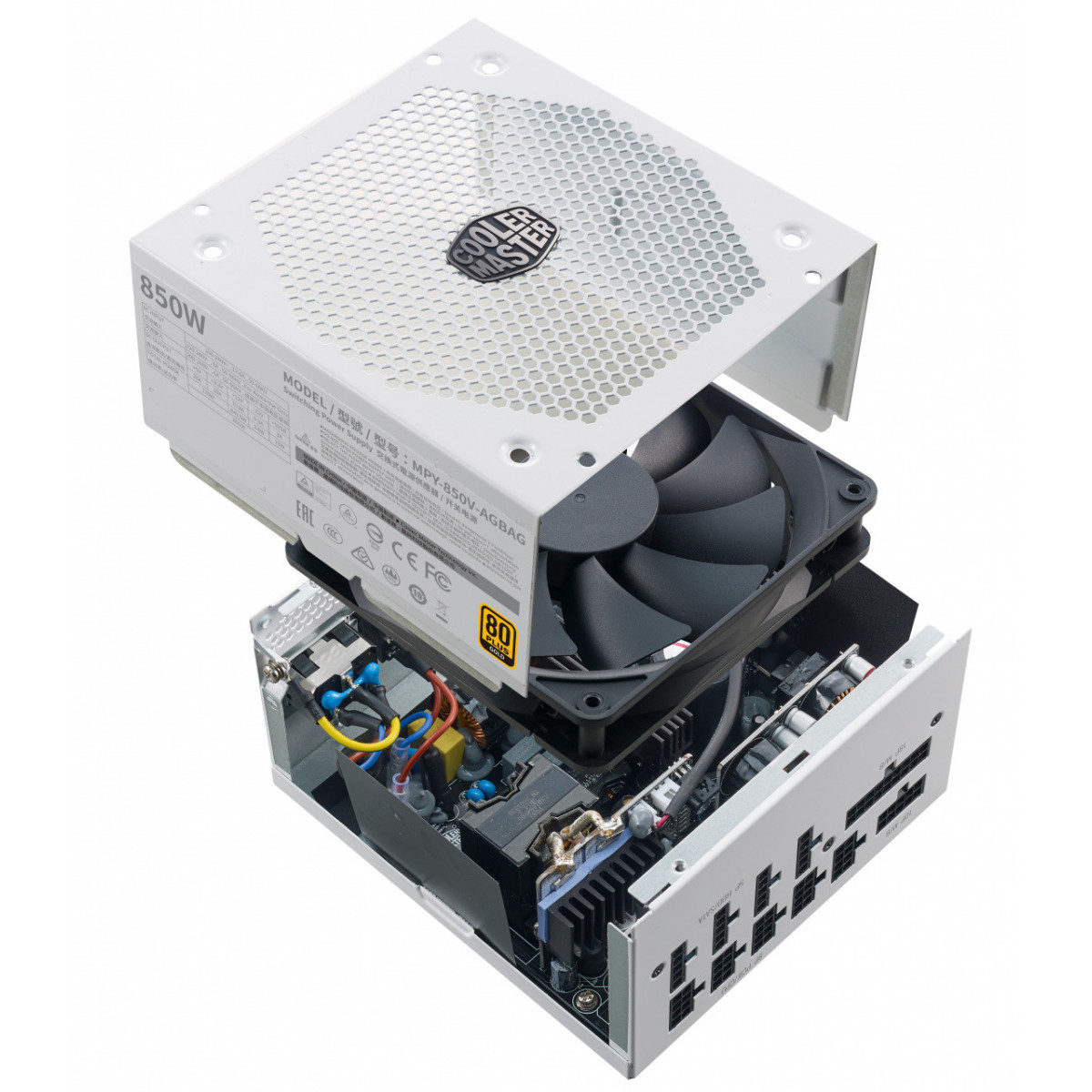 Cooler Master V850 Gold-V2 White Edition. Potenza totale: 850 W, Tensione di ingresso AC: 100 - 240 V, Frequenza di ingresso AC: 50/60 Hz. Connettore scheda madre: 24-pin ATX, Tipo di cablaggio: Modulare. Utilizzo: PC, Fattore di forma dell'unità di alimentazione (PSU): ATX, Certificazione 80 PLUS: 80 PLUS Gold. Colore del prodotto: Bianco, Tipo di raffreddamento: Attivo, Diametro del ventilatore: 13,5 cm. Larghezza: 150 mm, Profondità: 160 mm, Altezza: 86 mm