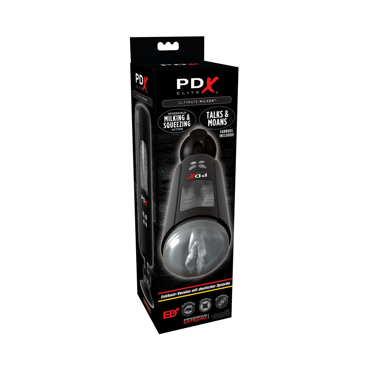 Elegante masturbatore con 10 fasi di mungitura e 5 velocità. Particolarmente emozionante è la funzione sonora, che seduce l'utente con diversi suoni e detti in lingua tedesca. Questo si attiva non appena le cuffie in dotazione vengono inserite. Il canale del piacere del manicotto rimovibile è dotato di scanalature per lo stimolo intensivo e di stimoli. Un ulteriore punto di forza è il supporto a parete integrato, che permette di godere a mani libere, mentre la finestra nel masturbatore permette un'emozionante visione dell'azione. Incluso cavo di ricarica USB e 3 anelli per il pene in diversi diametri.