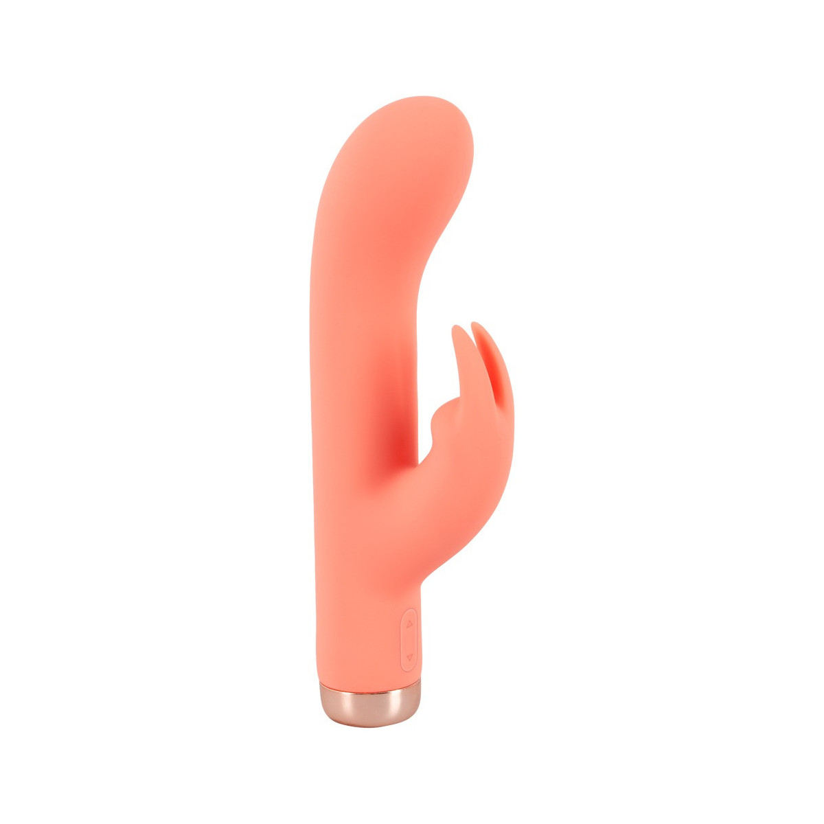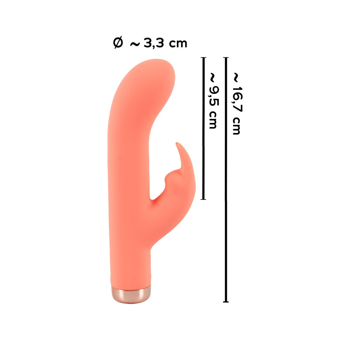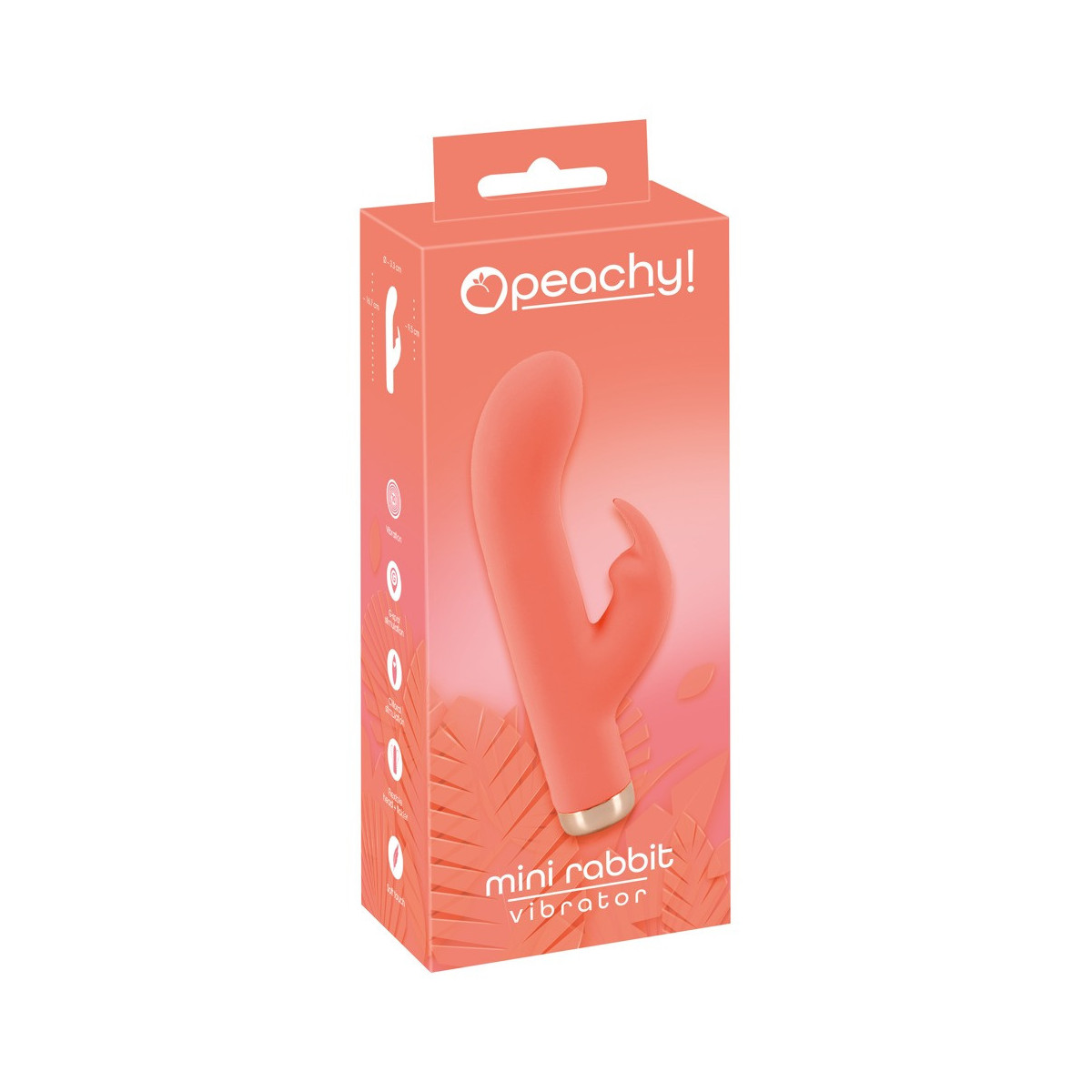 Mini vibratore Rabbit di peachy! in un design curvo ideale con testa massaggiante e stimolatore del clitoride in design coniglietto. Stimola la vagina, il punto G e il clitoride allo stesso tempo. 10 modalità di vibrazione forniscono un divertimento vario e possono essere facilmente controllate su e giù al tocco di un pulsante. Il materiale in silicone di alta qualità con una consistenza morbida al tatto fornisce una sensazione di pelle molto piacevole durante il gioco e le coccole. Ricaricabile - cavo di ricarica USB incluso.