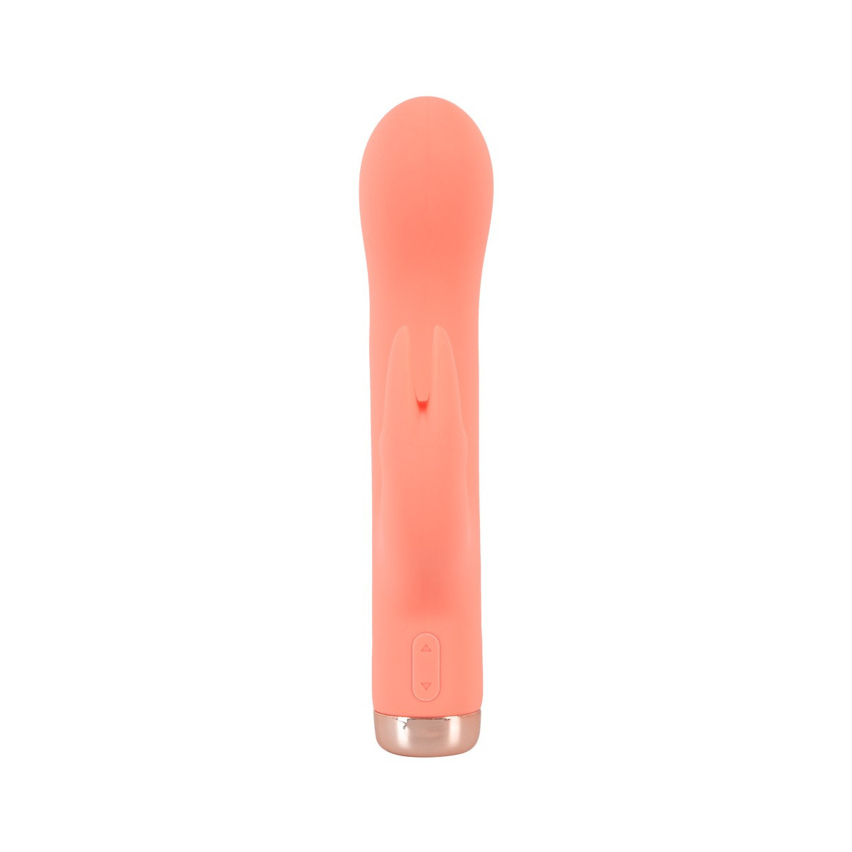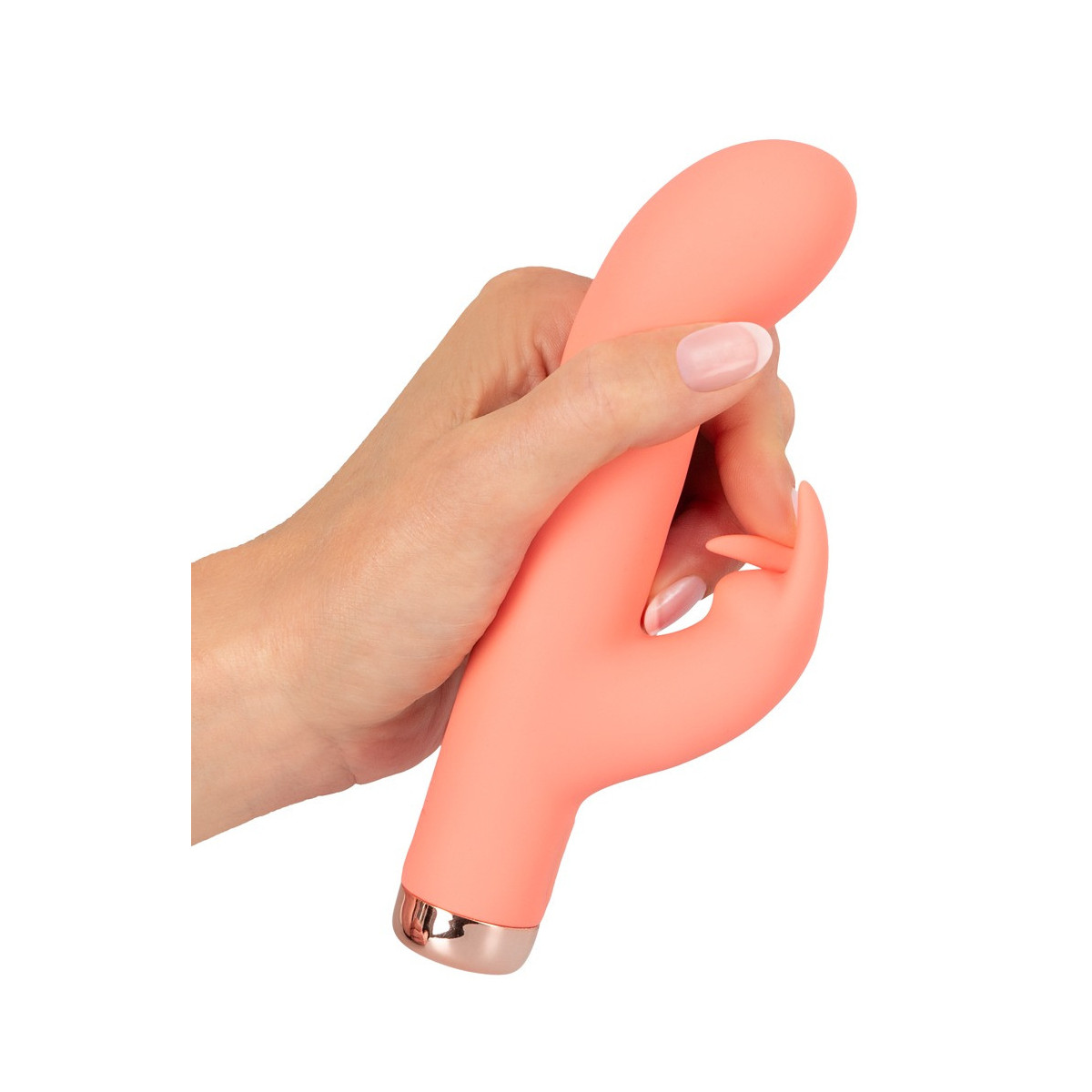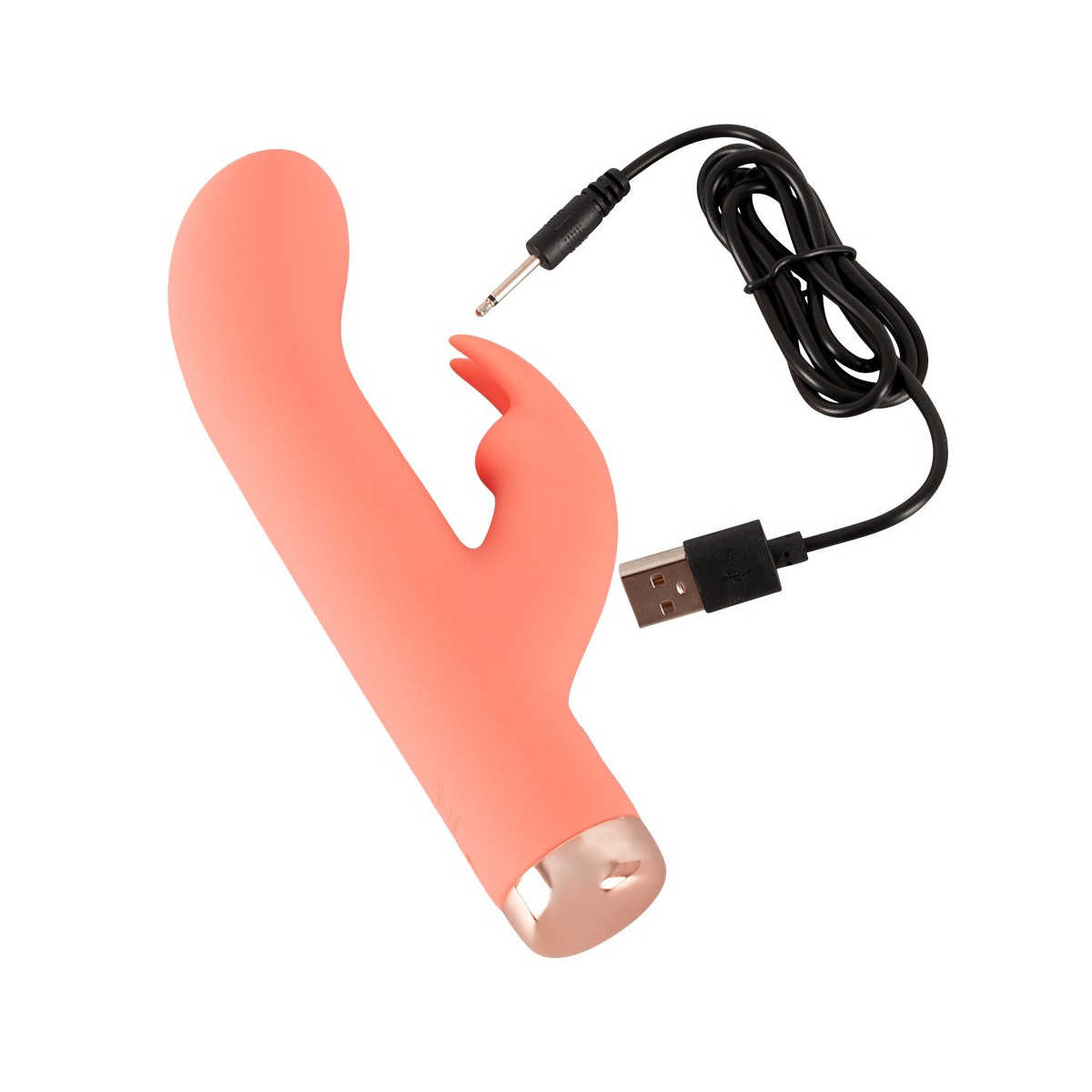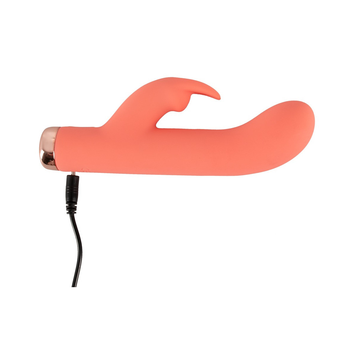 Mini vibratore Rabbit di peachy! in un design curvo ideale con testa massaggiante e stimolatore del clitoride in design coniglietto. Stimola la vagina, il punto G e il clitoride allo stesso tempo. 10 modalità di vibrazione forniscono un divertimento vario e possono essere facilmente controllate su e giù al tocco di un pulsante. Il materiale in silicone di alta qualità con una consistenza morbida al tatto fornisce una sensazione di pelle molto piacevole durante il gioco e le coccole. Ricaricabile - cavo di ricarica USB incluso.