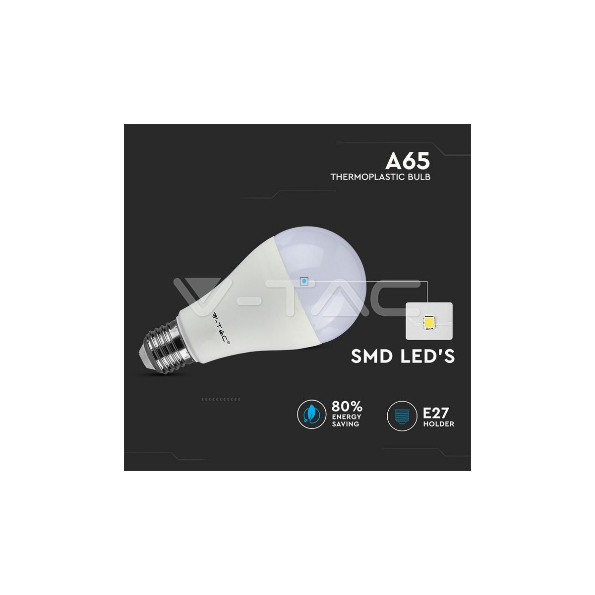 V-TAC VT-2015. Potenza lampadina: 15 W, Lampadina di potenza equivalente: 90 W, Attacco lampada: E27, Flusso luminoso: 1350 lm, Durata della lampadina: 20000 h, Colore della luce: Bianco, Temperatura colore: 6400 K, Angolo proiezione: 200°, Color Rendering Index (CRI): 80, Fattore di potenza: 0,5